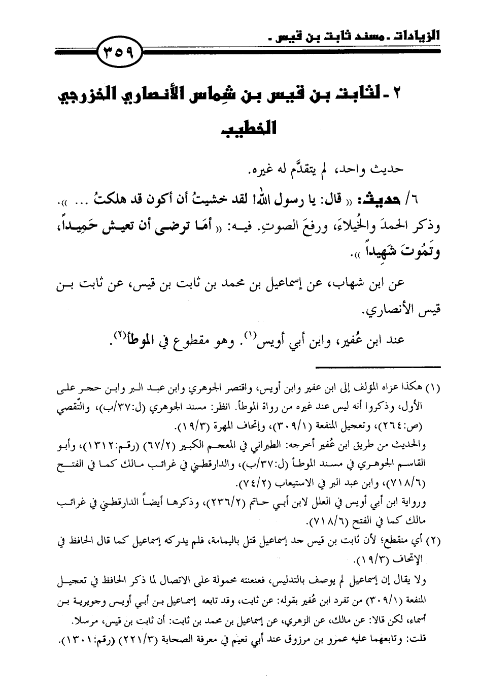 (٢) أي منقطع، لأن ثابت بن قيس جد إسماعيل قتل باليمامة، فلم يدركه إسماعيل كما قال الحافظ في الإتحاف (٣/ ١٩).