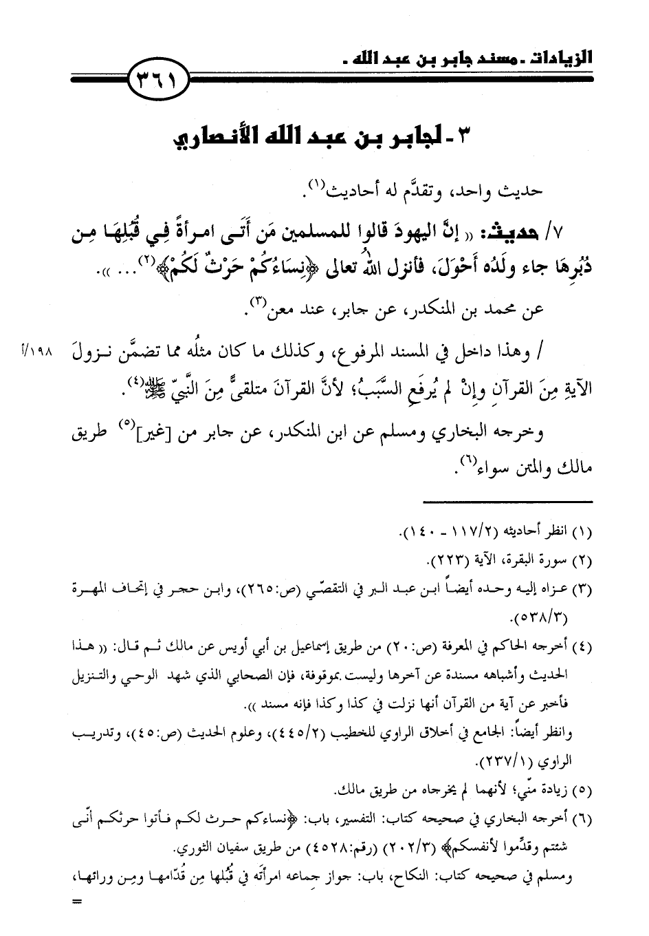 ٧ / حديث: "إنَّ اليهودَ قالوا للمسلمين مَن أَتَى امرأةً فِي قُبُلِهَا مِن دُبُرِهَا جاء ولَدُه أَحْوَلَ، فأنْزل اللهُ تعالى {نِسَاؤُكُمْ حَرْثٌ لَكُمْ} (٢) ... ".
