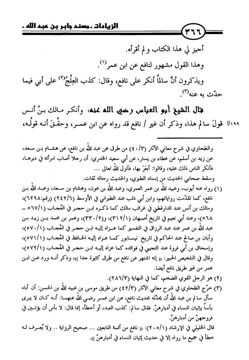 (٣) خرَّج الطحاوي في شرح معاني الآثار (٣/ ٤٢) من طريق موسى بن عبيد الله بن الحسن: أن أباه سأل سالم بن عبد الله أن يحدِّثه بحديث نافع، عن ابن عمر رضي الله عنهما: أنه كان لا يرى بأسًا بإتيان النساء في أدبارهنَّ. فقال سالم: كذب العبد، أو أخطأ، إنما قال: لا بأس أن يؤتين في فروجهن من أدبارهن.