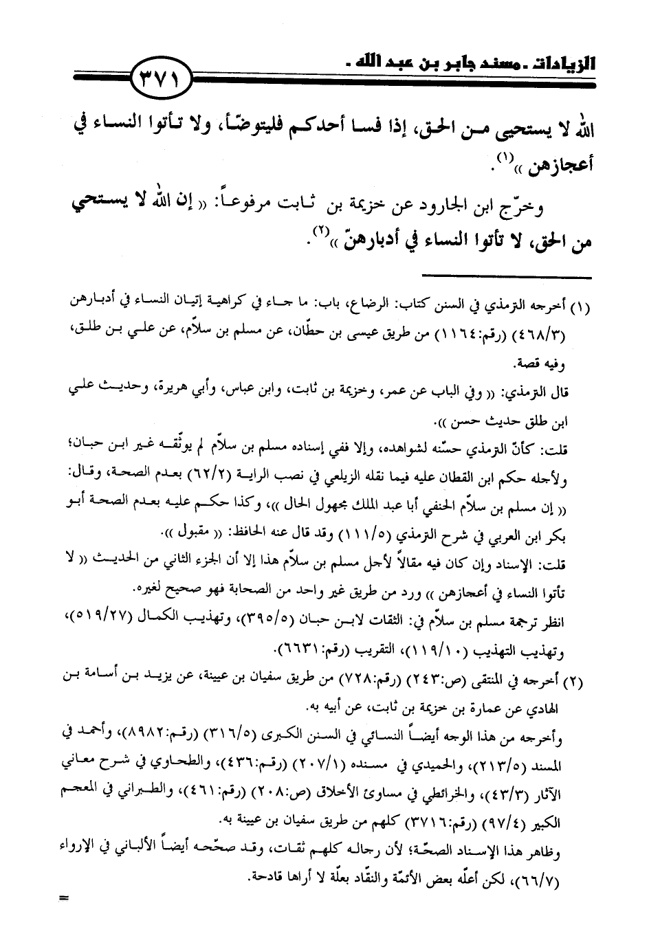 (١) أخرجه الزمذي في السنن كتاب: الرضاع، باب: ما جاء في كراهية إتيان النساء في أدبارهن (٣/ ٤٦٨) رقم: ١١٦٤) من طريق عيسى بن حطّان، عن مسلم بن سلّام، عن علي بن طلق، وفيه قصة.