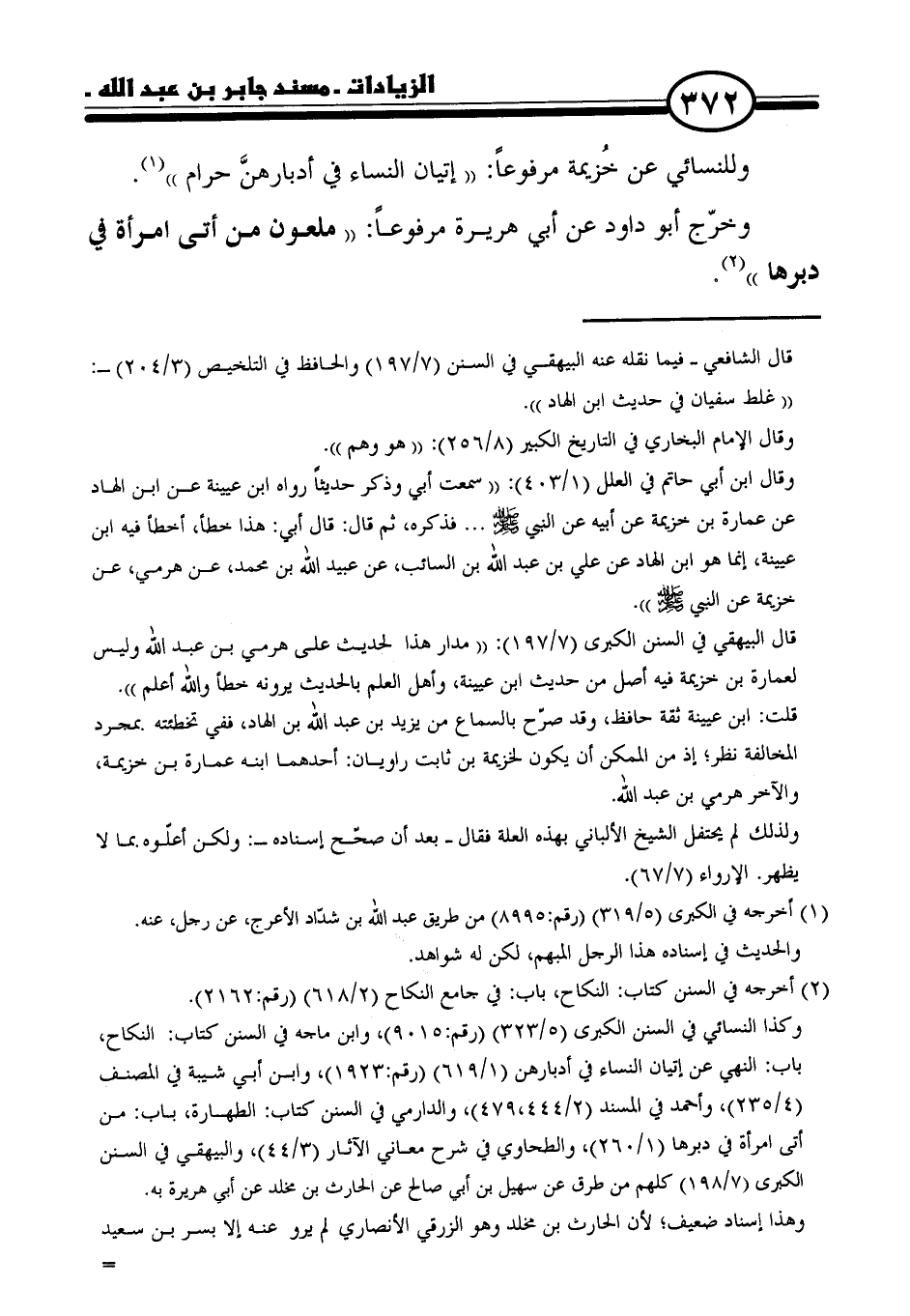 وكذا النسائي في السنن الكبرى (٥/ ٣٢٣) (رقم: ٩٠١٥)، وابن ماجه في السنن كتاب: النكاح، باب: النهي عن إتيان النساء في أدبارهن (١/ ٦١٩) (رقم: ١٩٢٣)، وابن أبي شيبة في المصنف (٤/ ٢٣٥)، وأحمد في المسند (٢/ ٤٤٤، ٤٧٩)، والدارمي في السنن كتاب: الطهارة، باب: من أتى امرأة في دبرها (١/ ٢٦٠)، والطحاوي في شرح معاني الآثار (٣/ ٤٤)، والبيهقي في السنن الكبرى (٧/ ١٩٨) كلهم من طرق عن سهيل بن أبي صالح عن الحارث بن مخلد عن أبي هريرة به.