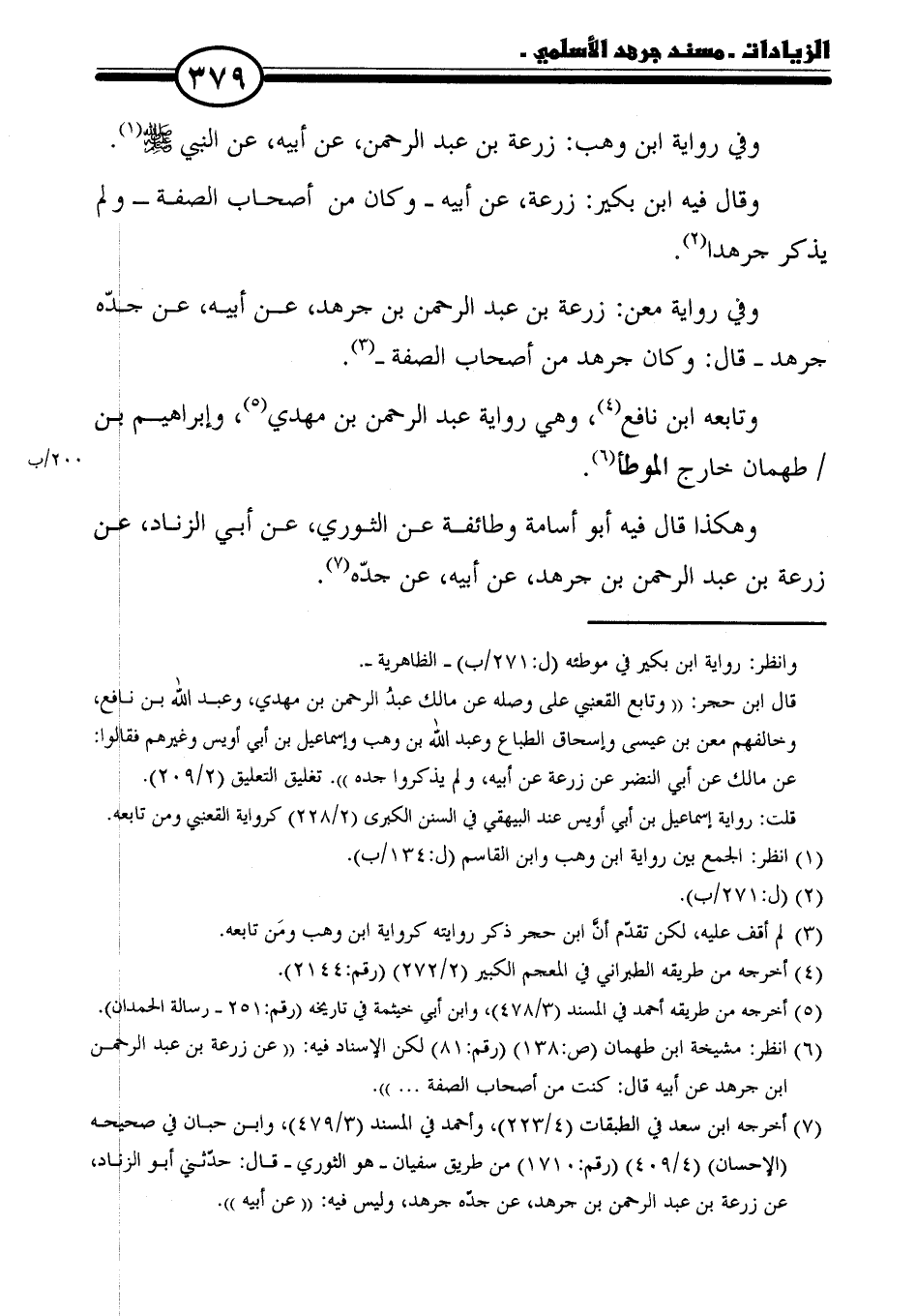 (٧) أخرجه ابن سعد في الطبقات (٤/ ٢٢٣)، وأحمد في المسند (٣/ ٤٧٩)، وابن حبان في صحيحه (الإحسان) (٤/ ٤٠٩) (رقم: ١٧١٠) من طريق سفيان -هو الثوري- قال: حدّثني أبو الزناد، عن زرعة بن عبد الرحمن بن جرهد، عن جدّه جرهد، وليس فيه: "عن أبيه".