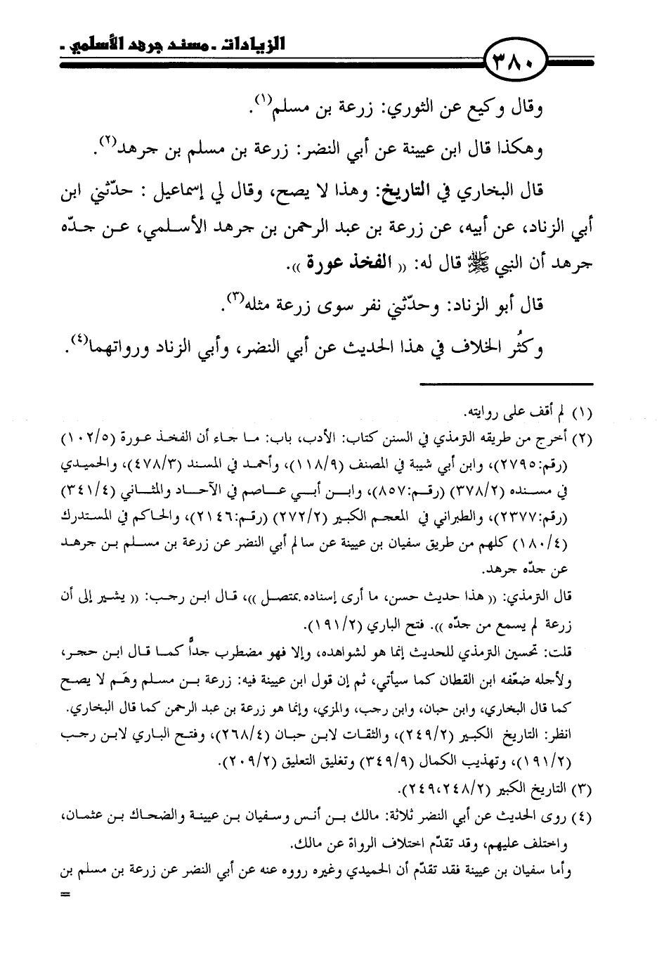 (٢) أخرج من طريقه الترمذي في السنن كتاب: الأدب، باب: ما جاء أن الفخذ عورة (٥/ ١٠٢) (رقم: ٢٧٩٥)، وابن أبي شيبة في المصنف (٩/ ١١٨)، وأحمد في المسند (٣/ ٤٧٨)، والحميدي في مسنده (٢/ ٣٧٨) (رقم: ٨٥٧)، وابن أبي عاصم في الآحاد والمثاني (٤/ ٣٤١) (رقم: ٢٣٧٧)، والطبراني في المعجم الكبير (٢/ ٢٧٢) (رقم: ٢١٤٦)، والحاكم في المستدرك (٤/ ١٨٠) كلهم من طريق سفيان بن عيينة عن سالم أبي النضر عن زرعة بن مسلم بن جرهد عن جدّه جرهد.