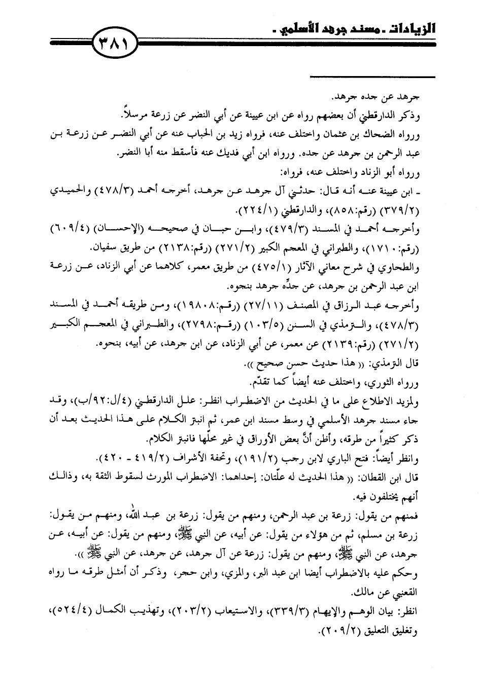 ولمزيد الاطلاع على ما في الحديث من الاضطراب انظر: علل الدارقطني (٤ / ل: ٩٢ / ب)، وقد جاء مسند جرهد الأسلمي في وسط مسند ابن عمر، ثم انبتر الكلام على هذا الحديث بعد أن ذكر كثيرًا من طرقه، وأظن أن بعض الأوراق في غير محلّها فانبتر الكلام.