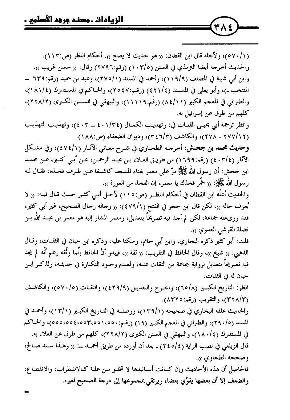 والحديث أعلّه ابن القطان في أحكام النظر (ص: ١١٥) لأجل أبي كثير حيث قال فيه: "لا يُعرف حاله"، لكن قال ابن حجر في الفتح (١/ ٤٧٩): "رجاله رجال الصحيح، غير أبي كثير، فقد روى عنه جماعة، لكن لم أجد فيه تصريحًا بتعديل، ومعمر المشار إليه هو معمر بن عبد الله بن نضلة القرشي العدوي".