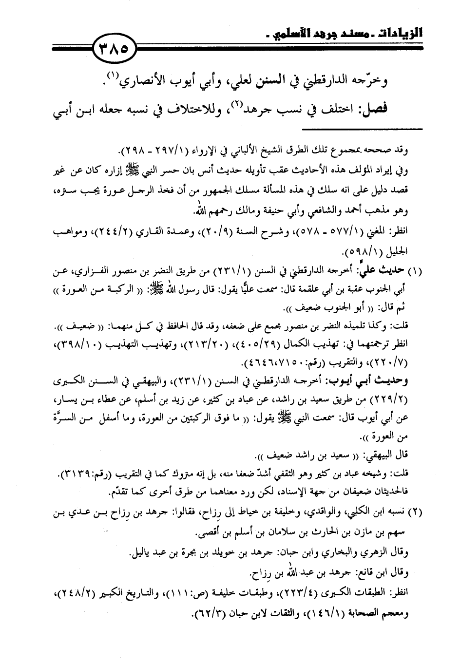 (١) حديث عليٍّ: أخرجه الدارقطني في السنن (١/ ٢٣١) من طريق النضر بن منصور الفزاري، عن أبي الجنوب عقبة بن أبي علقمة قال: سمعت عليًّا يقول: قال رسول الله - صلى الله عليه وسلم -: "الركبة من العورة" ثم قال: "أبو الجنوب ضعيف".