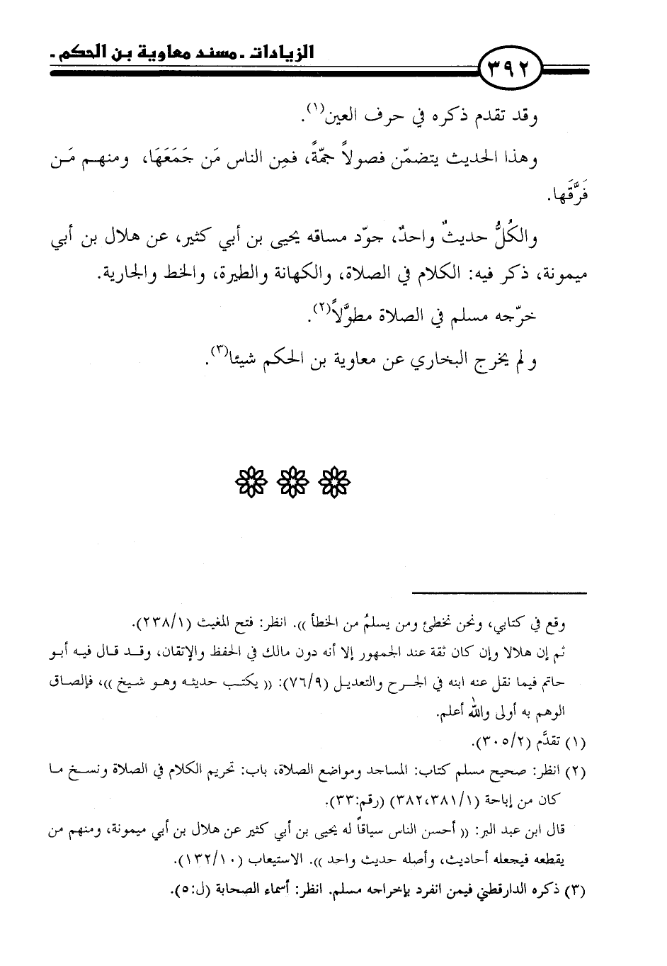 والكُلُّ حديثٌ واحدٌ، جوّد مساقه يحيى بن أبي كثير، عن هلال بن أبي ميمونة، ذكر فيه: الكلام في الصلاة، والكهانة والطيرة، والخط والجارية.