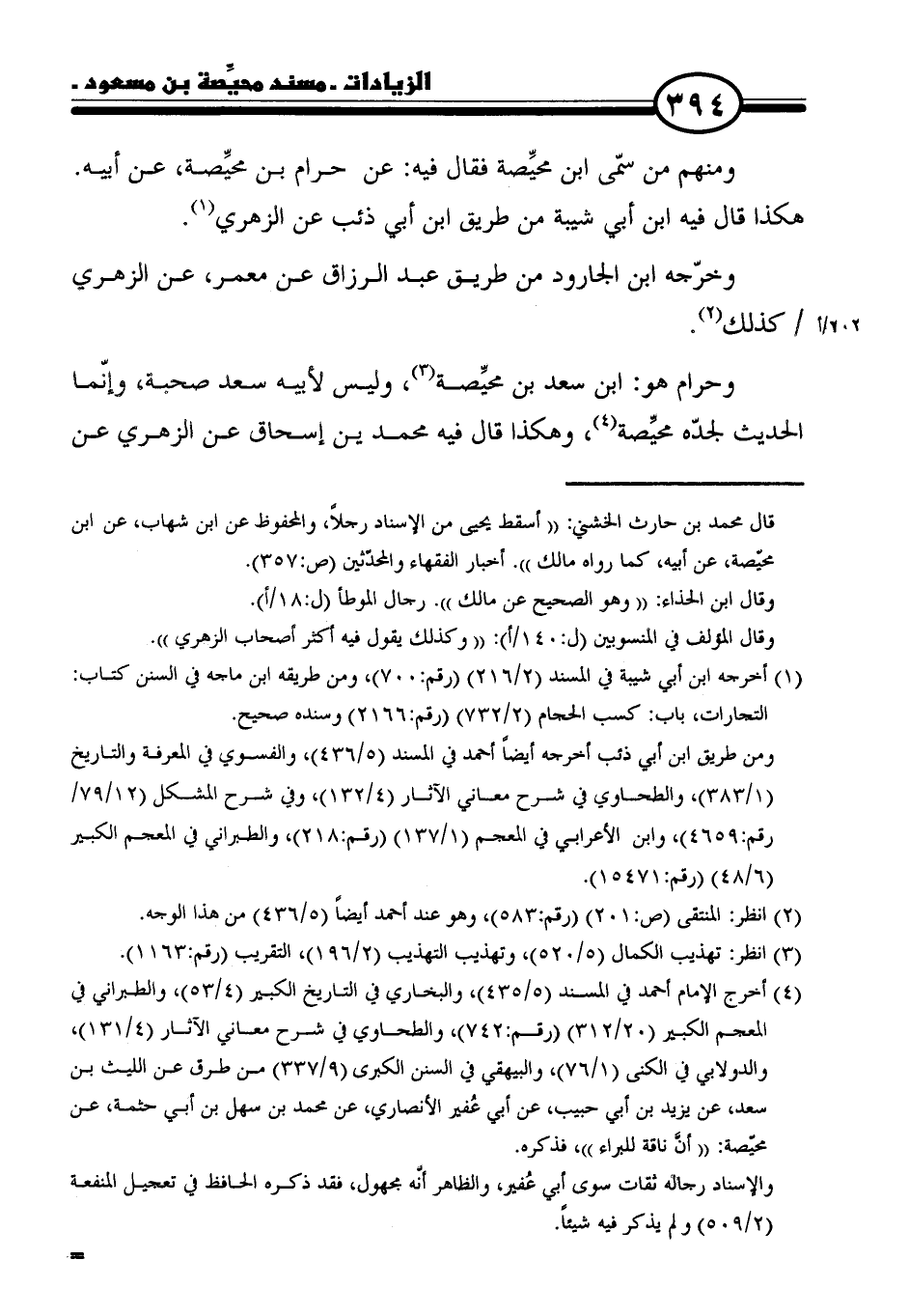 وحرام هو: ابن سعد بن محيِّصة (٣)، وليس لأبيه سعد صحبة، وإنّما الحديث لجدّه محيِّصة (٤)، وهكذا قال فيه محمد بن إسحاق عن الزهري عن