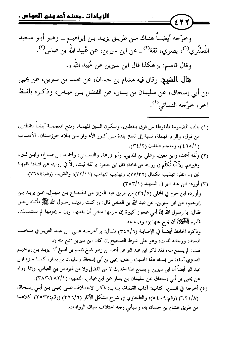 قال الشيخ: وقال فيه هشام بن حسان، عن محمد بن سيرين، عن يحيى بن أبي إسحاق، عن سليمان بن يسار، عن الفضل بن عباس، وذكره بلفظ آخر، خرّجه النسائي (٤).