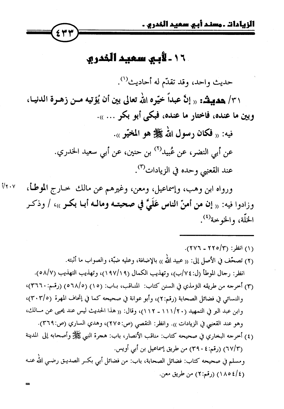 (٣) أخرجه من طريقه الترمذي في السنن كتاب: المناقب، باب: (١٥) (٥/ ٥٦٨) (رقم: ٣٦٦٠)، والنسائي في فضائل الصحابة (رقم: ٢)، وأبو عوانة في صحيحه كما في إتحاف المهرة (٥/ ٣٠٣)، وابن عبد البر في التمهيد (٢٠/ ١١١ - ١١٢)، وقال: "هذا الحديث ليس عند يحيى عن مالك، وهو عند القعنبي في الزيادات". وانظر: التقصي (ص: ٢٧٥)، وهدي الساري (ص: ٣٦٩).