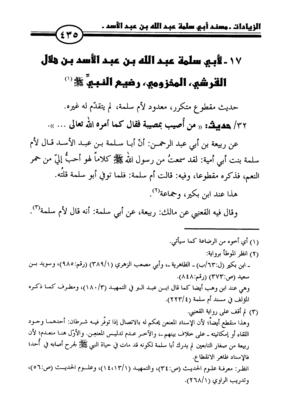 ١٧ - لأبي سلمة عبد الله بن عبد الأسد بن هلال القرشي، المخزومي، رضيع النبيِّ - صلى الله عليه وسلم - (١)