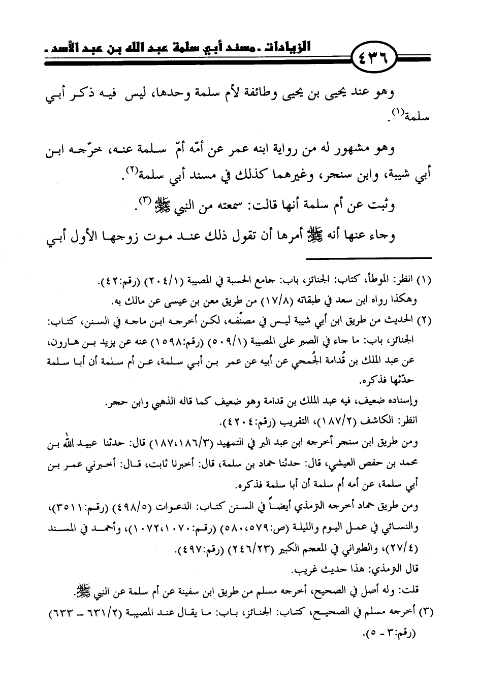 ومن طريق ابن سنجر أخرجه ابن عبد البر في التمهيد (٣/ ١٨٦ , ١٨٧) قال: حدثنا عبيد الله بن محمد بن حفص العيشي، قال: حدثنا حماد بن سلمة، قال: أخبرنا ثابت، قال: أخبرني عمر بن أبي سلمة، عن أمه أم سلمة أن أبا سلمة فذكره.