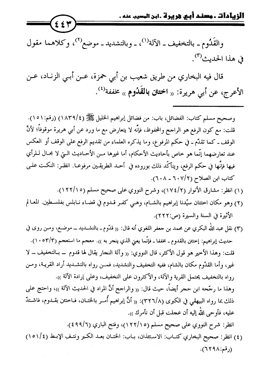قال فيه البخاري من طريق شعيب بن أبي حمزة، عن أبي الزناد، عن الأعرج، عن أبي هريرة: "اختتن بالقَدُوم" مخففة (٤).