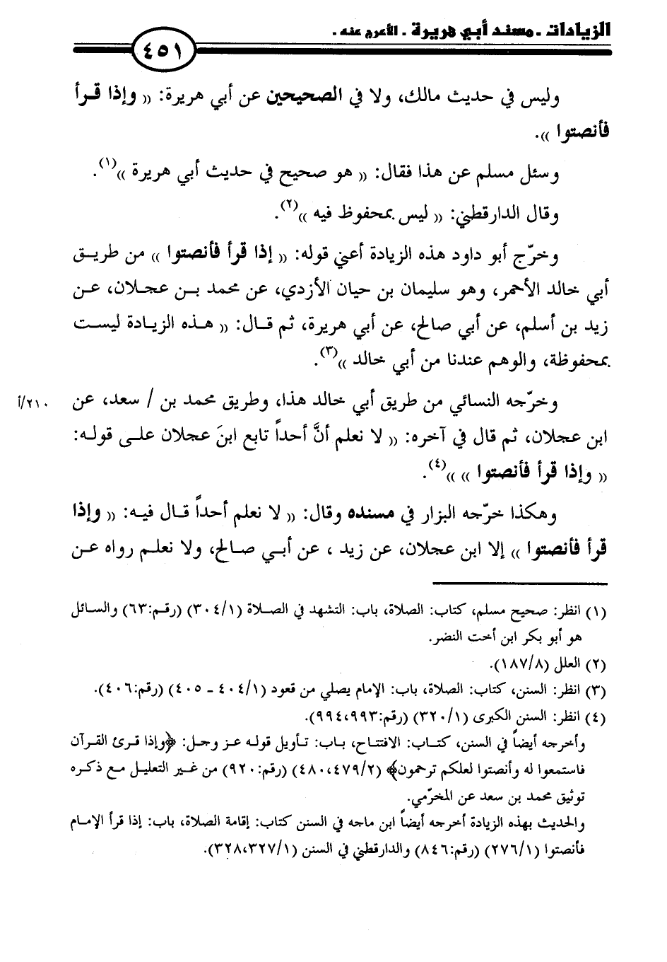 وهكذا خرّجه البزار في مسنده وقال: "لا نعلم أحدًا قال فيه: "وإذا قرأ فأنصتوا" إلا ابن عجلان، عن زيد، عن أبي صالح، ولا نعلم رواه عن