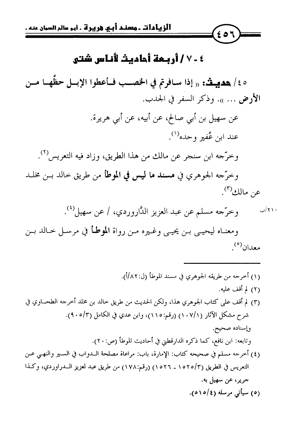 (٤) أخرجه مسلم في صحيحه كتاب: الإمارة، باب: مراعاة مصلحة الدواب في السير والنهي عن التعريس في الطريق (٣/ ١٥٢٥ - ١٥٢٦) (رقم: ١٧٨) من طريق عبد العزيز الدراوردي، وكذا جرير، عن سهيل به.