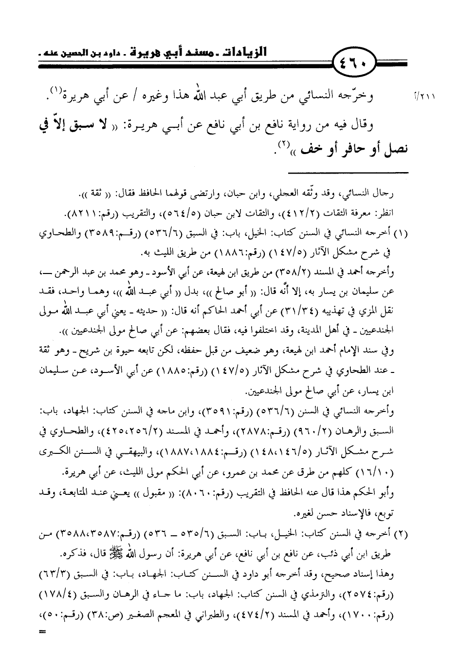 (٢) أخرجه في السنن كتاب: الخيل، باب: السبق (٦/ ٥٣٥ - ٥٣٦) (رقم: ٣٥٨٧، ٣٥٨٨) من طريق ابن أبي ذئب، عن نافع بن أبي نافع، عن أبي هريرة: أن رسول الله - صلى الله عليه وسلم - قال، فذكره.