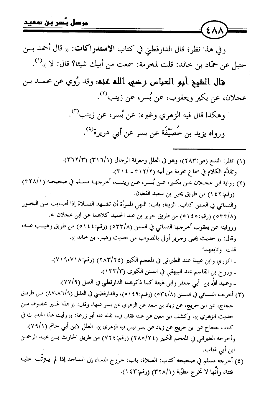 (٣) أخرجه النسائي في السنن (٨/ ٥٣٤) (رقم: ٥١٤٩)، والدارقطني في العلل (٩/ ٨٦، ٨٧) من طريق حجاج، عن ابن جريج، عن زياد بن سعد عن الزهري عن بسر عنها، وقال: "هذا غير محفوظ من حديث الزهري"، وكشف ابن معين عن علته فقال فيما نقله عنه أبو زرعة: "رأيت هذا الحديث في كتاب حجاج عن ابن جريج عن زياد عن بسر ليس فيه الزهري". العلل لابن أبي حاتم (١/ ٧٩).