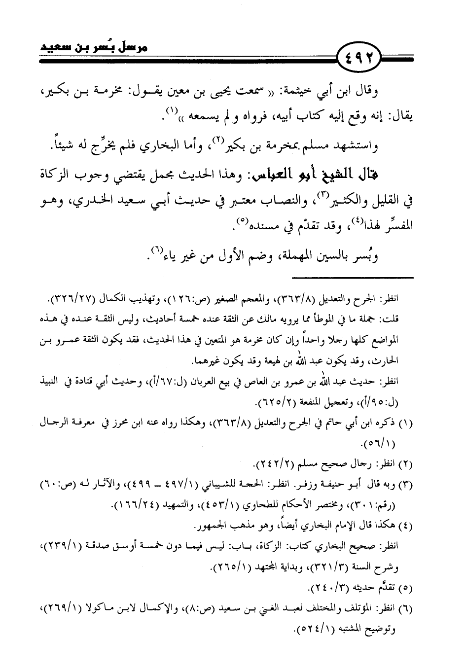 (٦) انظر: المؤتلف والمختلف لعبد الغني بن سعيد (ص: ٨)، والإكمال لابن ماكولا (١/ ٢٦٩)، وتوضيح المشتبه (١/ ٥٢٤).