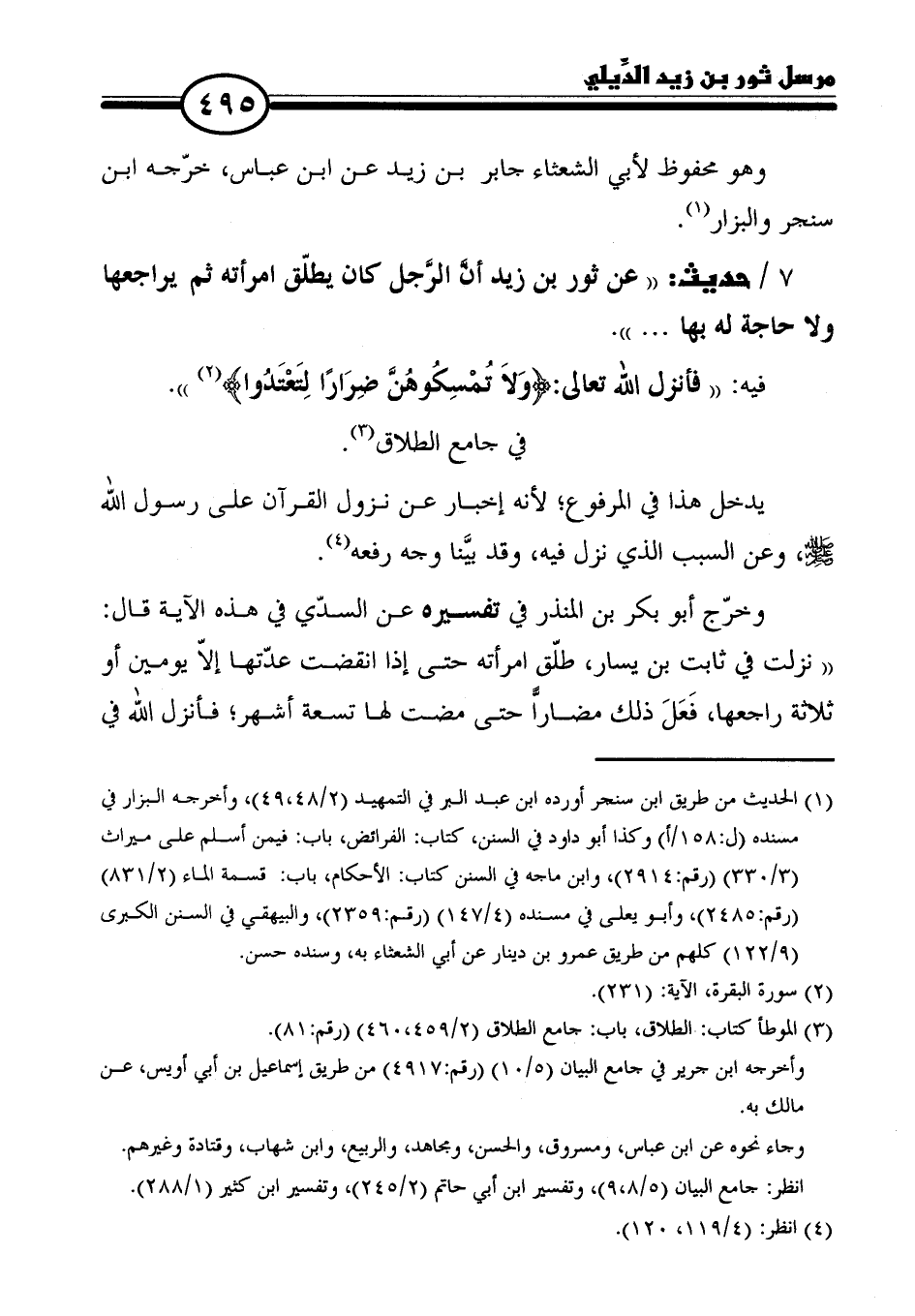 ٧ / حديث: "عن ثور بن زيد أن الرَّجل كان يطلّق امرأته ثم يراجعها ولا حاجة له بها ... ".