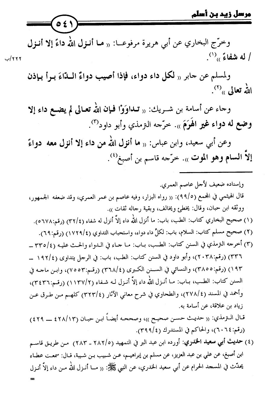 (٣) أخرجه الترمذي في السنن كتاب: الطب، باب: ما جاء في الدواء والحث عليه (٤/ ٣٣٥ - ٣٣٦) (رقم: ٢٠٣٨)، وأبو داود في السنن كتاب: الطب، باب: في الرجل يتداوى (٤/ ١٩٢ - ١٩٣) (رقم: ٣٨٥٥)، والنسائي في السنن الكبرى (٤/ ٣٦٨) (رقم: ٧٥٥٣)، وابن ماجه في السنن كتاب: الطب، باب: ما أنزل الله داء إلَّا أنزل له شفاء (٢/ ١١٣٧) (رقم: ٣٤٣٦)، وأحمد في المسند (٤/ ٢٧٨)، والطحاوي في شرح معاني الآثار (٤/ ٣٢٣) كلهم من طرق عن زياد بن علاقة، عن أسامة به.