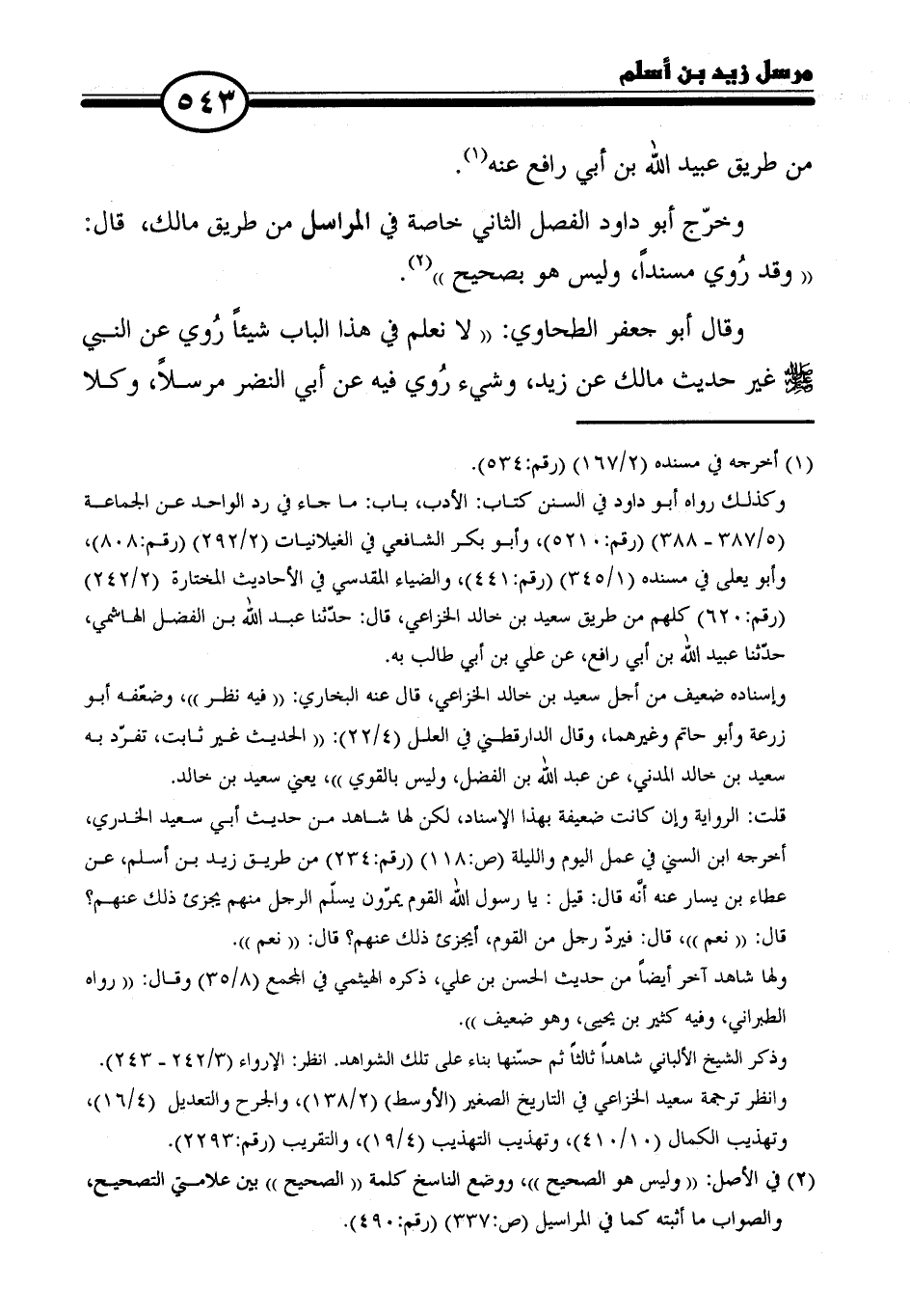 وقال أبو جعفر الطحاوي: "لا نعلم في هذا الباب شيئًا رُوي عن النبي - صلى الله عليه وسلم - غير حديث مالك عن زيد، وشيء رُوي فيه عن أبي النضر مرسلًا، وكلا