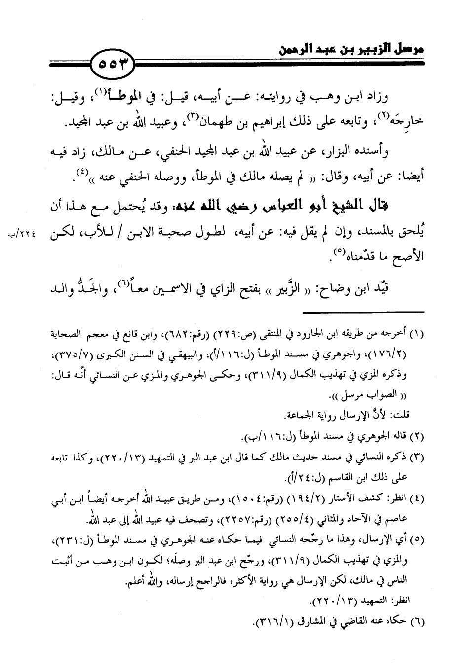 (٥) أي الإرسال، وهذا ما رجّحه النسائي فيما حكاه عنه الجوهري في مسند الموطأ (ل: ٢٣١)، والمزي في تهذيب الكمال (٩/ ٣١١)، ورجح ابن عبد البر وصلَه؛ لكون ابن وهب من أثبت الناس في مالك، لكن الإرسال هي رواية الأكثر، فالراجح إرساله، والله أعلم.