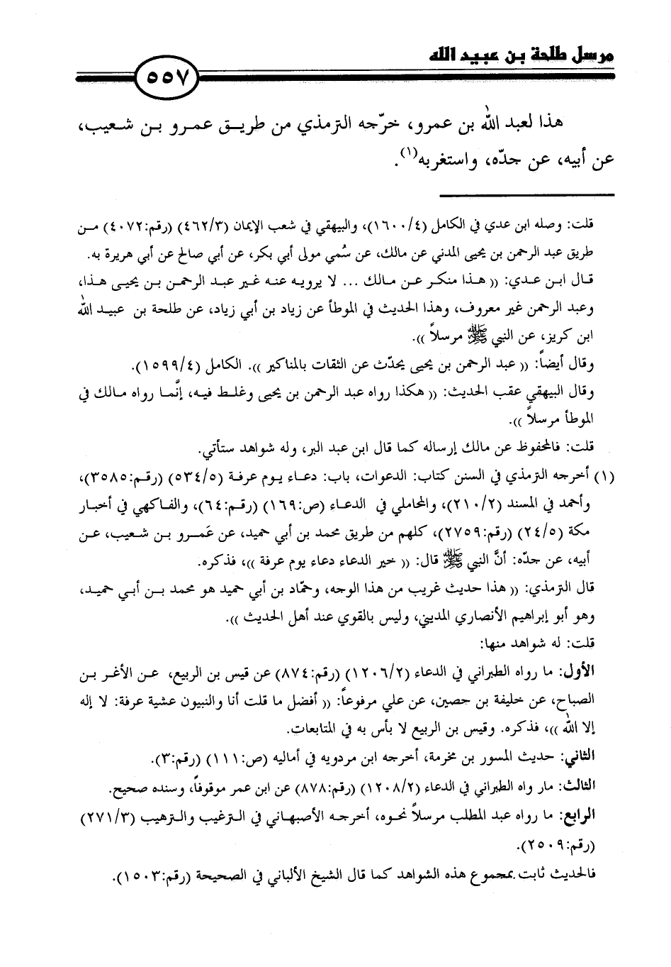 (١) أخرجه الترمذي في السنن كتاب: الدعوات، باب: دعاء يوم عرفة (٥/ ٥٣٤) (رقم: ٣٥٨٥)، وأحمد في المسند (٢/ ٢١٠)، والمحاملي في الدعاء (ص: ١٦٩) (رقم: ٦٤)، والفاكهي في أخبار مكة (٥/ ٢٤) (رقم: ٢٧٥٩)، كلهم من طريق محمد بن أبي حميد، عن عَمرو بن شعيب، عن أبيه، عن جدّه: أن النبي - صلى الله عليه وسلم - قال: "خير الدعاء دعاء يوم عرفة"، فذكره.
