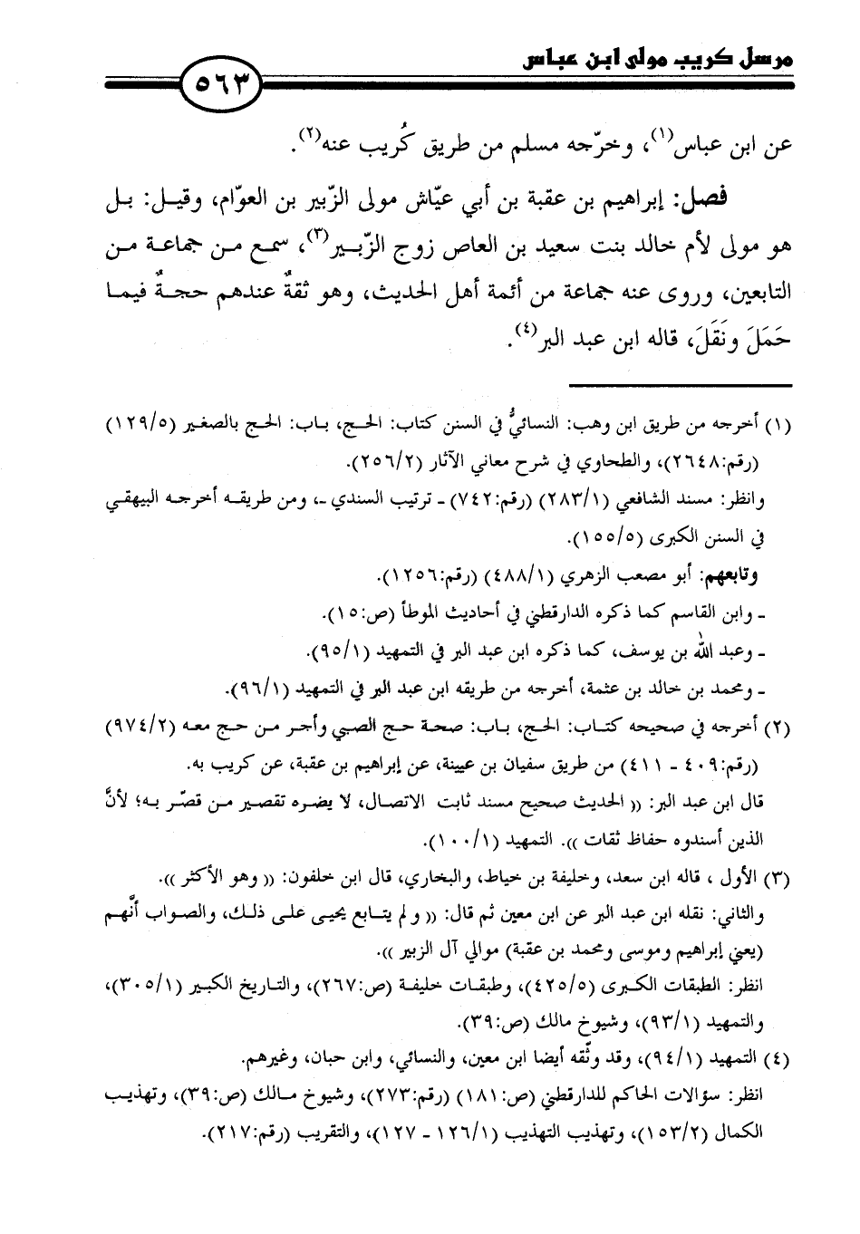 فصل: إبراهيم بن عقبة بن أبي عيّاش مولى الزُّبَيْر بن العوّام، وقيل: بل هو مولى لأم خالد بنت سعيد بن العاص زوج الزُّبَيْر (٣)، سمع من جماعة من التابعين، وروى عنه جماعة من أئمة أهل الحديث، وهو ثقةٌ عندهم حجةٌ فيما حَمَلَ ونَقَلَ، قاله ابن عبد البر (٤).