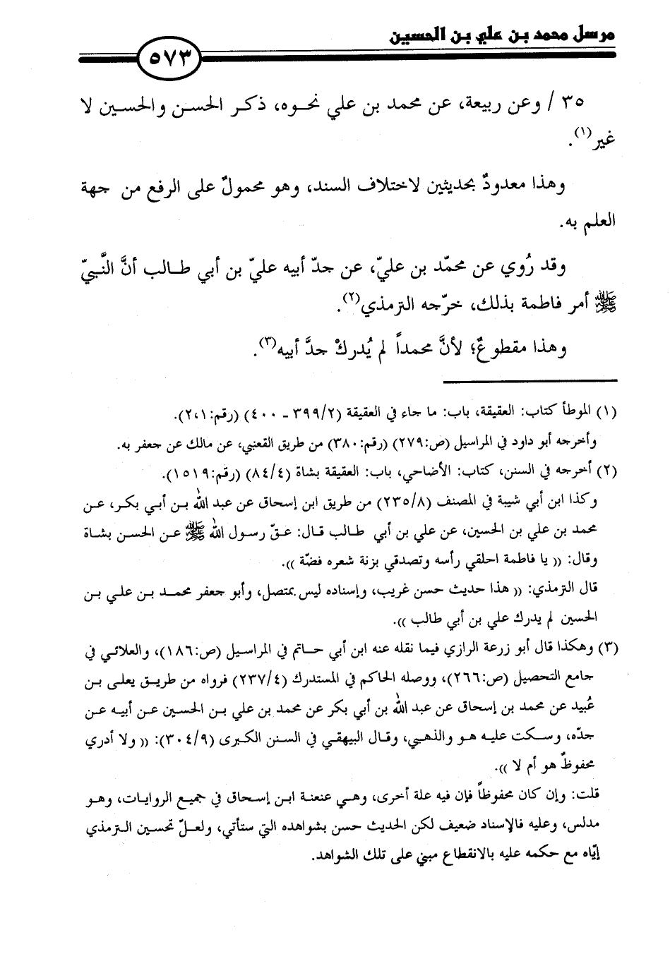 قال الترمذي: "هذا حديث حسن غريب، وإسناده ليس بمتصل، وأبو جعفر محمَّد بن علي بن الحسين لم يدرك علي بن أبي طالب".