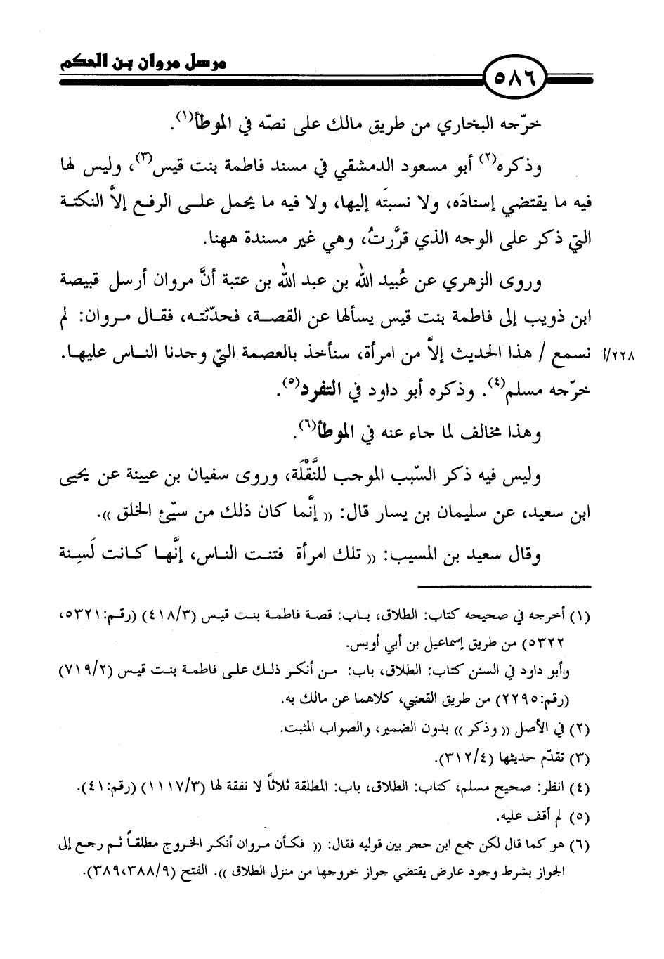 (٦) هو كما قال لكن جمع ابن حجر بين قوليه فقال: "فكأن مروان أنكر الخروج مطلقًا ثمَّ رجع إلى الجواز بشرط وجود عارض يقتضي جواز خروجها من منزل الطلاق". الفتح (٩/ ٣٨٨، ٣٨٩).