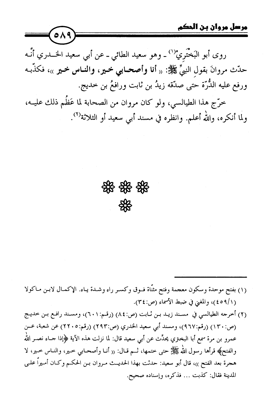 (٢) أخرجه الطيالسي في مسند زيد بن ثابت (ص: ٨٤) (رقم: ٦٠١)، ومسند رافع بن خديج (ص: ١٣٠) (رقم: ٩٦٧)، ومسند أبي سعيد الخدري (ص: ٢٩٣) (رقم: ٢٢٠٥) عن شعبة، عن عمرو بن مرة سمع أبا البختري يحدِّث عن أبي سعيد قال: لما نزلت هذه الآية {إِذَا جَاءَ نَصْرُ اللَّهِ وَالْفَتْحُ} قرأها رسول الله - صلى الله عليه وسلم - حتى ختمها، ثمَّ قال: "أنا وأصحابي خير، والناس خيم، لا هجرة بعد الفتح"، قال أبو سعيد: حدثت بهذا الحديث مروان بن الحكم وكان أميرًا على المدينة فقال: كذبت. . . فذكره، وإسناده صحيح.