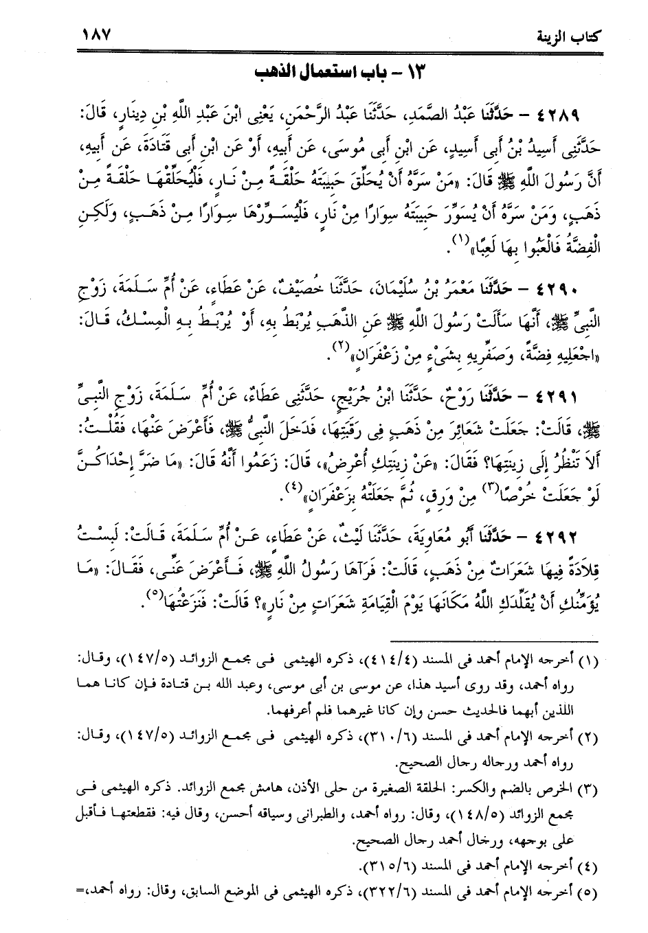 4292 - حَدَّثَنَا أَبُو مُعَاوِيَةَ، حَدَّثَنَا لَيْثٌ، عَنْ عَطَاءٍ، عَنْ أُمِّ سَلَمَةَ، قَالَتْ: لَبِسْتُ قِلاَدَةً فِيهَا شَعَرَاتٌ مِنْ ذَهَبٍ، قَالَتْ: فَرَآهَا رَسُولُ اللَّهِ صلى الله عليه وسلم، فَأَعْرَضَ عَنِّى، فَقَالَ: مَا يُؤَمِّنُكِ أَنْ يُقَلِّدَكِ اللَّهُ مَكَانَهَا يَوْمَ الْقِيَامَةِ شَعَرَاتٍ مِنْ نَارٍ؟ قَالَتْ: فَنَزَعْتُهَا.