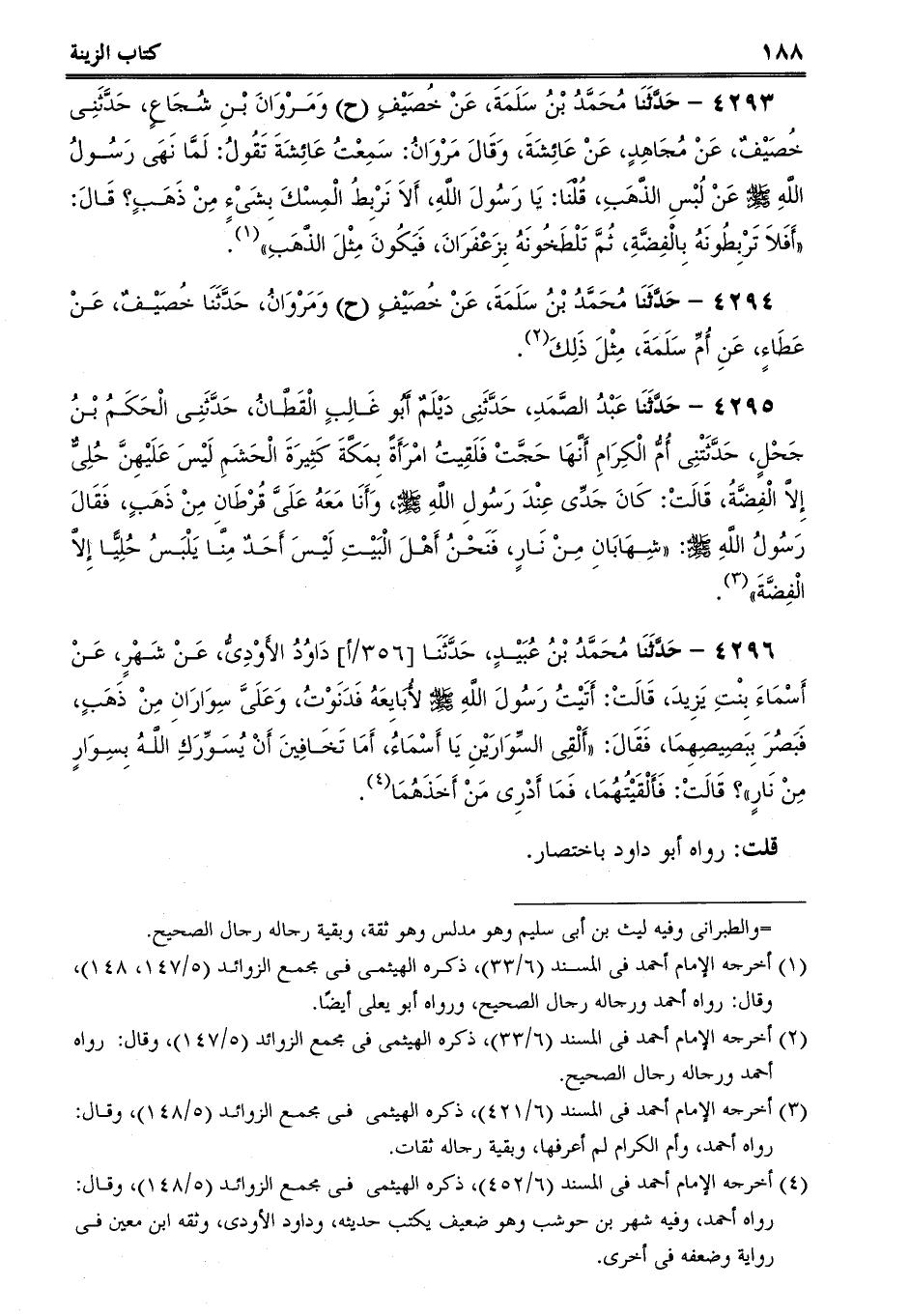 4296 - حَدَّثَنَا مُحَمَّدُ بْنُ عُبَيْدٍ، حَدَّثَنَا دَاوُدُ الأَوْدِىُّ، عَنْ شَهْرٍ، عَنْ أَسْمَاءَ بِنْتِ يَزِيدَ، قَالَتْ: أَتَيْتُ رَسُولَ اللَّهِ صلى الله عليه وسلم لأُبَايِعَهُ فَدَنَوْتُ، وَعَلَىَّ سِوَارَانِ مِنْ ذَهَبٍ، فَبَصُرَ بِبَصِيصِهِمَا، فَقَالَ: أَلْقِى السِّوَارَيْنِ يَا أَسْمَاءُ، أَمَا تَخَافِينَ أَنْ يُسَوِّرَكِ اللَّهُ بِسِوَارٍ مِنْ نَارٍ؟ قَالَتْ: فَأَلْقَيْتُهُمَا، فَمَا أَدْرِى مَنْ أَخَذَهُمَا.