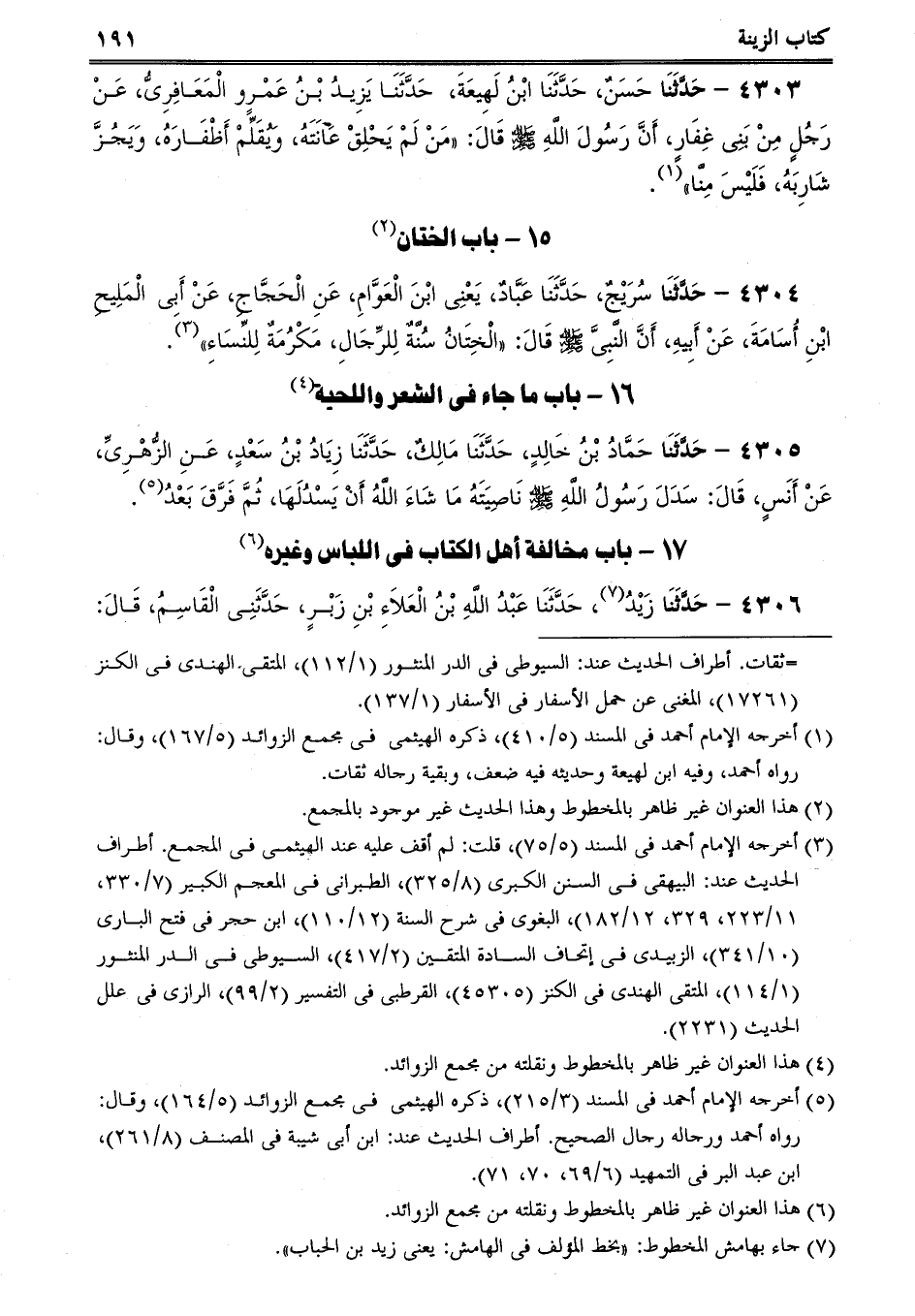 4306 - حَدَّثَنَا زَيْدُ، حَدَّثَنَا عَبْدُ اللَّهِ بْنُ الْعَلاَءِ بْنِ زَبْرٍ، حَدَّثَنِى الْقَاسِمُ، قَالَ: -[192]- سَمِعْتُ أَبَا أُمَامَةَ يَقُولُ: خَرَجَ رَسُولُ اللَّهِ صلى الله عليه وسلم عَلَى مَشْيَخَةٍ مِنَ الأَنْصَارٍ بِيضٌ لِحَاهُمْ، فَقَالَ: يَا مَعْشَرَ الأَنْصَارِ، حَمِّرُوا وَصَفِّرُوا وَخَالِفُوا أَهْلَ الْكِتَابِ، قَالَ: فَقُلْتُ: يَا رَسُولَ اللَّهِ، إِنَّ أَهْلَ الْكِتَابِ يَتَسَرْوَلَونَ وَلاَ يَأْتَزِرُونَ، فَقَالَ رَسُولُ اللَّهِ صلى الله عليه وسلم: تَسَرْوَلُوا وَائْتَزِرُوا وَخَالِفُوا أَهْلَ الْكِتَابِ، قَالَ: فَقُلْتُ: يَا رَسُولَ اللَّهِ، إِنَّ أَهْلَ الْكِتَابِ يَتَخَفَّفُونَ وَلاَ يَنْتَعِلُونَ، قَالَ: فَقَالَ النَّبِىُّ صلى الله عليه وسلم: فَتَخَفَّفُوا وَانْتَعِلُوا وَخَالِفُوا أَهْلَ الْكِتَابِ، قَالَ: فَقُلْنَا: يَا رَسُولَ اللَّهِ، إِنَّ أَهْلَ الْكِتَابِ يَقُصُّونَ عَثَانِينَهُمْ وَيُوَفِّرُونَ سِبَالَهُمْ، قَالَ: فَقَالَ النَّبِىُّ صلى الله عليه وسلم: قُصُّوا سِبَالَكُمْ، وَوَفِّرُوا عَثَانِينَكُمْ، وَخَالِفُوا أَهْلَ الْكِتَابِ.