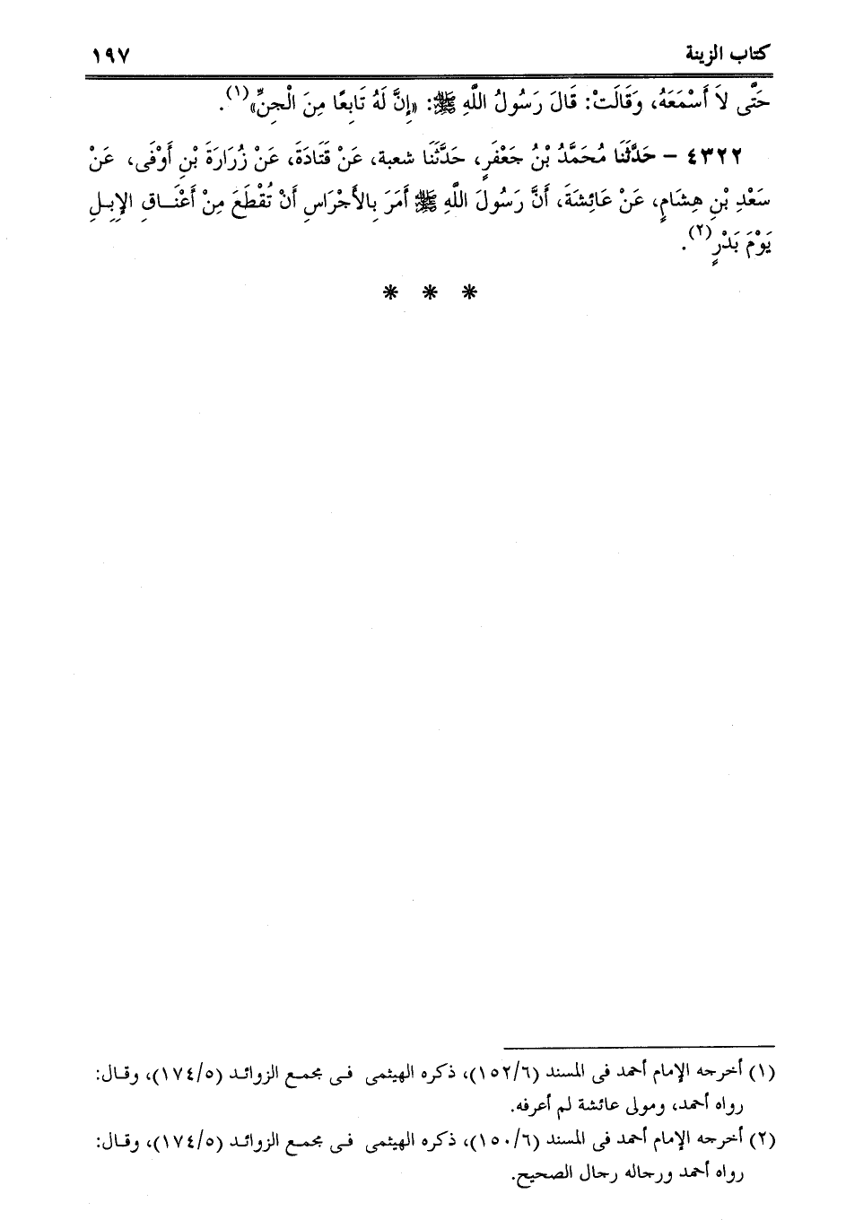 4322 - حَدَّثَنَا مُحَمَّدُ بْنُ جَعْفَرٍ، حَدَّثَنَا شعبة، عَنْ قَتَادَةَ، عَنْ زُرَارَةَ بْنِ أَوْفَى، عَنْ سَعْدِ بْنِ هِشَامٍ، عَنْ عَائِشَةَ، أَنَّ رَسُولَ اللَّهِ صلى الله عليه وسلم أَمَرَ بِالأَجْرَاسِ أَنْ تُقْطَعَ مِنْ أَعْنَاقِ الإِبِلِ يَوْمَ بَدْرٍ.