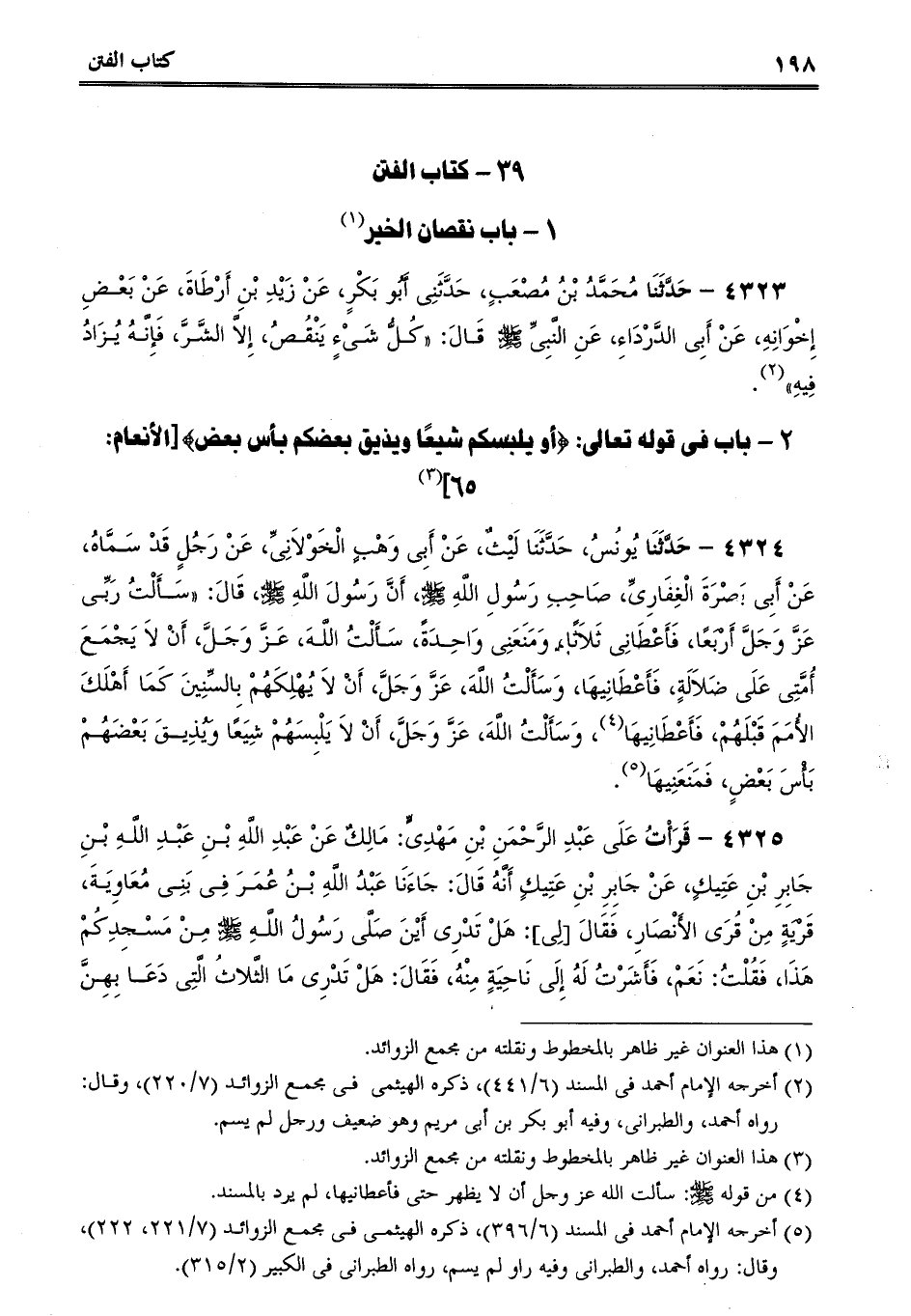 4325 - قَرَأْتُ عَلَى عَبْدِ الرَّحْمَنِ بْنِ مَهْدِىٍّ: مَالِكٌ عَنْ عَبْدِ اللَّهِ بْنِ عَبْدِ اللَّهِ بْنِ جَابِرِ بْنِ عَتِيكٍ، عَنْ جَابِرِ بْنِ عَتِيكٍ أَنَّهُ قَالَ: جَاءَنَا عَبْدُ اللَّهِ بْنُ عُمَرَ فِى بَنِى مُعَاوِيَةَ، قَرْيَةٍ مِنْ قُرَى الأَنْصَارِ، فَقَالَ [لِى] : هَلْ تَدْرِى أَيْنَ صَلَّى رَسُولُ اللَّهِ صلى الله عليه وسلم مِنْ مَسْجِدِكُمْ هَذَا، فَقُلْتُ: نَعَمْ، فَأَشَرْتُ لَهُ إِلَى نَاحِيَةٍ مِنْهُ، فَقَالَ: هَلْ تَدْرِى مَا الثَّلاثُ الَّتِى دَعَا بِهِنَّ -[199]- فِيهِ؟ فَقُلْتُ: نَعَمْ، قَالَ: فَأَخْبِرْنِى بِهِمْ، فَقُلْتُ: دَعَا بِأَنْ لاَ [يُظْهِرَ عَلَيْهِمْ عَدُوًّا مِنْ غَيْرِهِمْ وَلاَ يُهْلِكَهُمْ بِالسِّنِينَ، فَأُعْطِيَهُمَا، وَدَعَا بِأَنْ لاَ] يَجْعَلَ بَأْسَهُمْ بَيْنَهُمْ، فَمَنَعَنِيهَا، قَالَ: صَدَقْتَ، فَلاَ يَزَالُ الْهَرْجُ إِلَى يَوْمِ الْقِيَامَةِ.