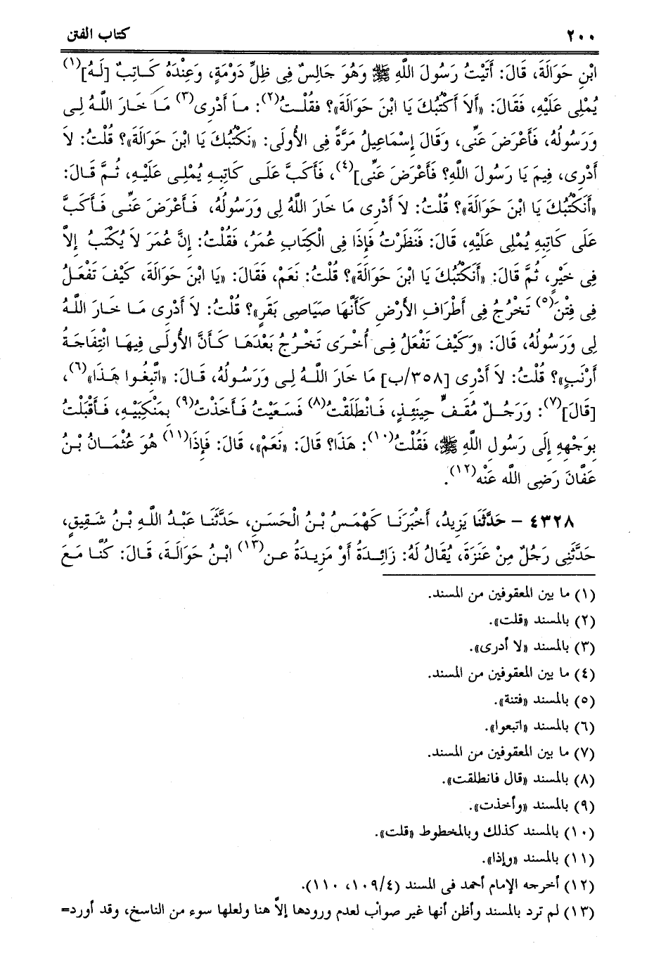4328 - حَدَّثَنَا يَزِيدُ، أَخْبَرَنَا كَهْمَسُ بْنُ الْحَسَنِ، حَدَّثَنَا عَبْدُ اللَّهِ بْنُ شَقِيقٍ، حَدَّثَنِى رَجُلٌ مِنْ عَنَزَةَ، يُقَالُ لَهُ: زَائِدَةُ أَوْ مَزِيدَةُ عن ابْنُ حَوَالَةَ، قَالَ: كُنَّا مَع -[201]- َ رَسُولِ اللَّهِ صلى الله عليه وسلم فِى سَفَرٍ مِنْ أَسْفَارِهِ، فَنَزَلَ النَّاسُ مَنْزِلاً، وَنَزَلَ النَّبِىُّ صلى الله عليه وسلم فِى ظِلِّ دَوْمَةٍ، فَرَآنِى مُقْبِلاً مِنْ حَاجَةٍ لِى، وَلَيْسَ غَيْرُهُ، وَغَيْرُ كَاتِبِهِ، فذكر نحوه، إلاَّ أَنه قًالَ فيه: فَإِذَا فِى صَدْرِ الْكِتَابِ أَبُو بَكْرٍ وَعُمَرُ، وَقَالَ فيه: أَصْنَعُ مَاذَا يَا رَسُولَ اللَّهِ؟ قَالَ: عَلَيْكَ بِالشَّامِ، وَقَالَ فيه: فَلاَ أَدْرِى كَيْفَ، قَالَ: فِى الآخِرَةِ وَلأَنْ أَكُونَ عَلِمْتُ كَيْفَ، قَالَ: فِى الآخِرَةِ أَحَبُّ إِلَىَّ مِنْ كَذَا وَكَذَا.