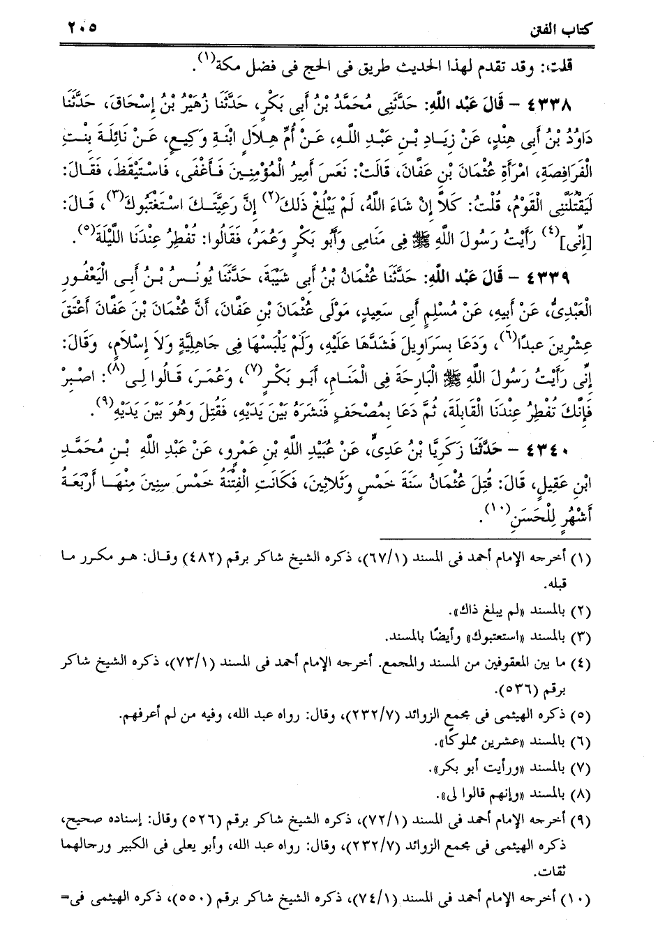 4338 - قَالَ عَبْد اللَّهِ: حَدَّثَنِى مُحَمَّدُ بْنُ أَبِى بَكْرٍ، حَدَّثَنَا زُهَيْرُ بْنُ إِسْحَاقَ، حَدَّثَنَا دَاوُدُ بْنُ أَبِى هِنْدٍ، عَنْ زِيَادِ بْنِ عَبْدِ اللَّهِ، عَنْ أُمِّ هِلاَلٍ ابْنَةِ وَكِيعٍ، عَنْ نَائِلَةَ بِنْتِ الْفَرَافِصَةِ، امْرَأَةِ عُثْمَانَ بْنِ عَفَّانَ، قَالَتْ: نَعَسَ أَمِيرُ الْمُؤْمِنِينَ فَأَغْفَى، فَاسْتَيْقَظَ، فَقَالَ: لَيَقْتُلَنَّنِى الْقَوْمُ، قُلْتُ: كَلاَّ إِنْ شَاءَ اللَّهُ، لَمْ يَبْلُغْ ذَلكَ إِنَّ رَعِيَّتَكَ اسْتَغْتَبُوكَ، قَالَ: [إِنِّى] رَأَيْتُ رَسُولَ اللَّهِ صلى الله عليه وسلم فِى مَنَامِى وَأَبُو بَكْرٍ وَعُمَرُ، فَقَالُوا: تُفْطِرُ عِنْدَنَا اللَّيْلَةَ.