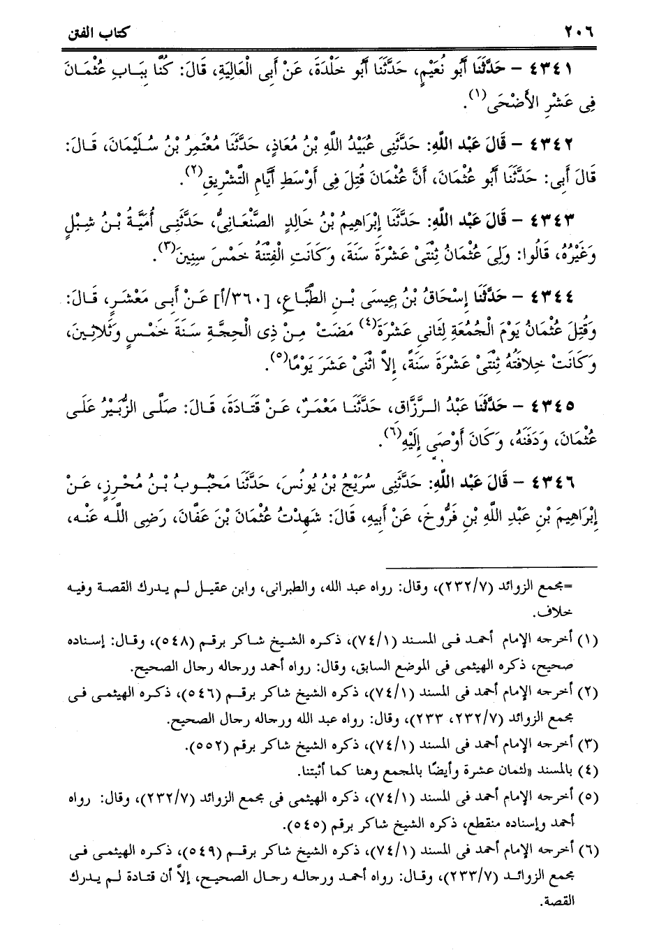 4343 - قَالَ عَبْد اللَّهِ: حَدَّثَنَا إِبْرَاهِيمُ بْنُ خَالِدٍ الصَّنْعَانِىُّ، حَدَّثَنِى أُمَيَّةُ بْنُ شِبْلٍ وَغَيْرُهُ، قَالُوا: وَلِىَ عُثْمَانُ ثِنْتَىْ عَشْرَةَ سَنَةَ، وَكَانَتِ الْفِتْنَةُ خَمْسَ سِنِينَ.