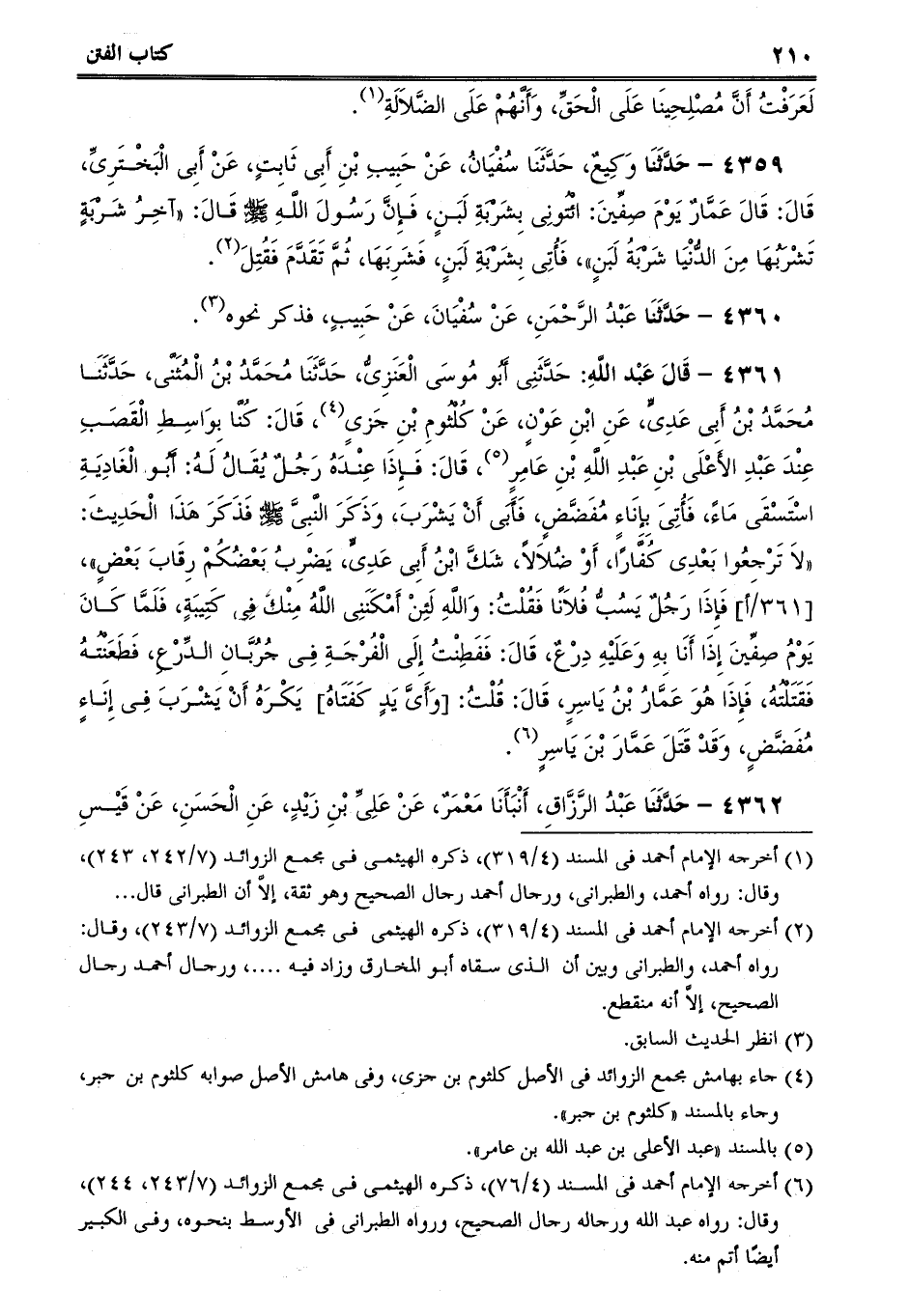 4361 - قَالَ عَبْد اللَّهِ: حَدَّثَنِى أَبُو مُوسَى الْعَنَزِىُّ، حَدَّثَنَا مُحَمَّدُ بْنُ الْمُثَنَّى، حَدَّثَنَا مُحَمَّدُ بْنُ أَبِى عَدِىٍّ، عَنِ ابْنِ عَوْنٍ، عَنْ كُلْثُومِ بْنِ جَزىٍ، قَالَ: كُنَّا بِوَاسِطِ الْقَصَبِ عِنْدَ عَبْدِ الأَعْلَى بْنِ عَبْدِ اللَّهِ بْنِ عَامِرٍ، قَالَ: فَإِذَا عِنْدَهُ رَجُلٌ يُقَالُ لَهُ: أَبُو الْغَادِيَةِ اسْتَسْقَى مَاءً، فَأُتِىَ بِإِنَاءٍ مُفَضَّضٍ، فَأَبَى أَنْ يَشْرَبَ، وَذَكَرَ النَّبِىَّ صلى الله عليه وسلم فَذَكَرَ هَذَا الْحَدِيثَ: لاَ تَرْجِعُوا بَعْدِى كُفَّارًا، أَوْ ضُلاَلاً، شَكَّ ابْنُ أَبِى عَدِىٍّ، يَضْرِبُ بَعْضُكُمْ رِقَابَ بَعْضٍ، فَإِذَا رَجُلٌ يَسُبُّ فُلاَنًا فَقُلْتُ: وَاللَّهِ لَئِنْ أَمْكَنَنِى اللَّهُ مِنْكَ فِى كَتِيبَةٍ، فَلَمَّا كَانَ يَوْمُ صِفِّينَ إِذَا أَنَا بِهِ وَعَلَيْهِ دِرْعٌ، قَالَ: فَفَطِنْتُ إِلَى الْفُرْجَةِ فِى جُرُبَّانِ الدِّرْعِ، فَطَعَنْتُهُ فَقَتَلْتُهُ، فَإِذَا هُوَ عَمَّارُ بْنُ يَاسِرٍ، قَالَ: قُلْتُ: [وَأَىَّ يَدٍ كَفَتَاهُ] يَكْرَهُ أَنْ يَشْرَبَ فِى إِنَاءٍ مُفَضَّضٍ، وَقَدْ قَتَلَ عَمَّارَ بْنَ يَاسِرٍ.