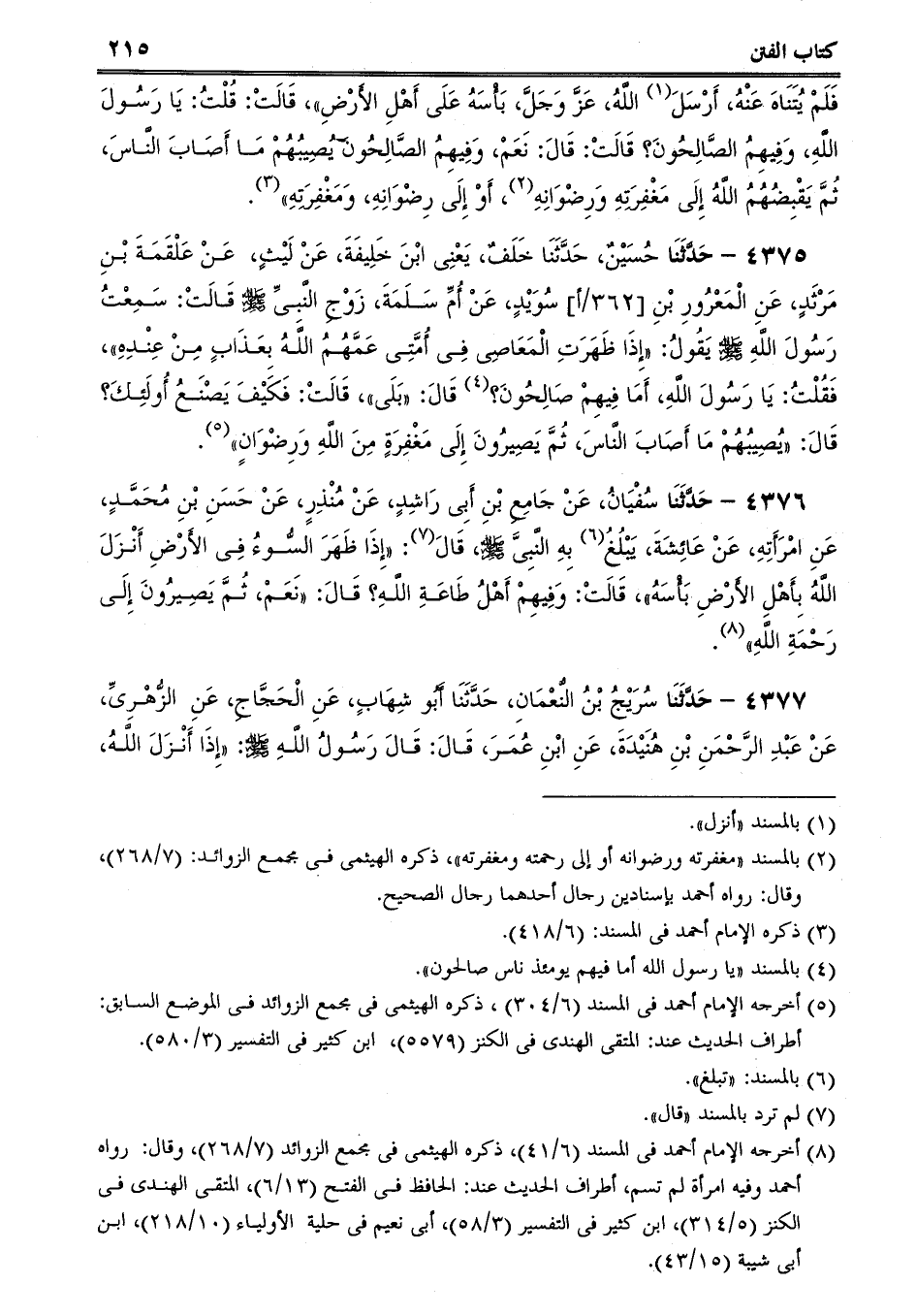 4377 - حَدَّثَنَا سُرَيْجُ بْنُ النُّعْمَانِ، حَدَّثَنَا أَبُو شِهَابٍ، عَنِ الْحَجَّاجِ، عَنِ الزُّهْرِىِّ، عَنْ عَبْدِ الرَّحْمَنِ بْنِ هُنَيْدَةَ، عَنِ ابْنِ عُمَرَ، قَالَ: قَالَ رَسُولُ اللَّهِ صلى الله عليه وسلم: إِذَا أَنْزَلَ اللَّهُ، -[216]- تبارك وتعالى، بِقَوْمٍ عَذَابًا أَصَابَ الْعَذَابُ مَنْ كَانَ بَيْنَ أَظْهُرِهِمْ، ثُمَّ يَبْعَثُهُمُ اللَّهُ تَعَالَى عَلَى أَعْمَالِهِمْ. قَالَ: كَذَا فِى الْكِتَابِ.