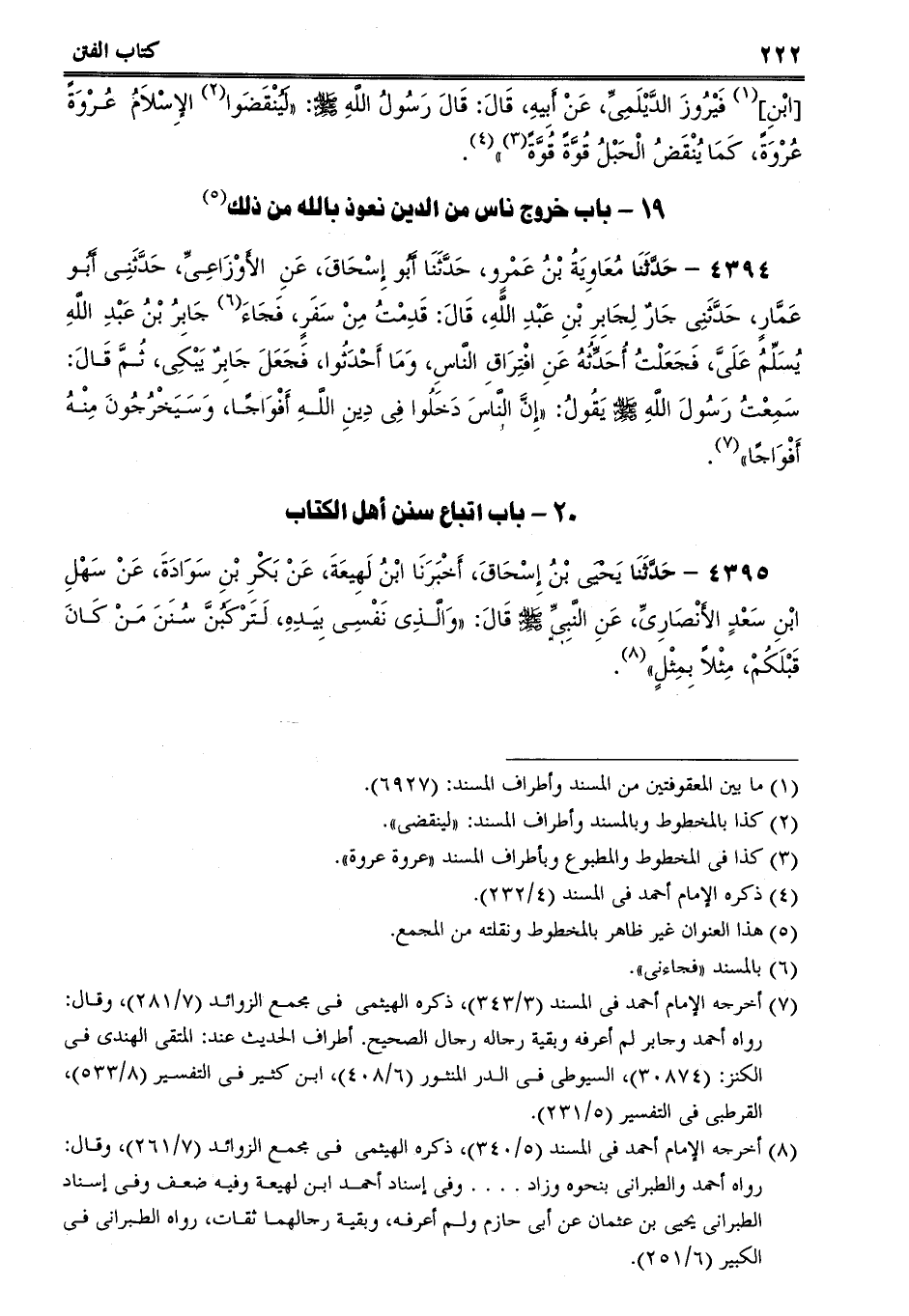 4394 - حَدَّثَنَا مُعَاوِيَةُ بْنُ عَمْرٍو، حَدَّثَنَا أَبُو إِسْحَاقَ، عَنِ الأَوْزَاعِىِّ، حَدَّثَنِى أَبُو عَمَّارٍ، حَدَّثَنِى جَارٌ لِجَابِرِ بْنِ عَبْدِ اللَّهِ، قَالَ: قَدِمْتُ مِنْ سَفَرٍ، فَجَاءَ جَابِرُ بْنُ عَبْدِ اللَّهِ يُسَلِّمُ عَلَىَّ، فَجَعَلْتُ أُحَدِّثُهُ عَنِ افْتِرَاقِ النَّاسِ، وَمَا أَحْدَثُوا، فَجَعَلَ جَابِرٌ يَبْكِى، ثُمَّ قَالَ: سَمِعْتُ رَسُولَ اللَّهِ صلى الله عليه وسلم يَقُولُ: إِنَّ النَّاسَ دَخَلُوا فِى دِينِ اللَّهِ أَفْوَاجًا، وَسَيَخْرُجُونَ مِنْهُ أَفْوَاجًا.