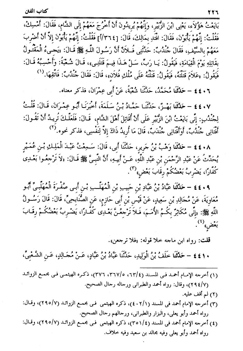 4409 - حَدَّثَنَا عَبَّادُ بْنُ عَبَّادِ بْنِ حَبِيبِ بْنِ الْمُهَلَّبِ بْنِ أَبِى صُفْرَةَ الْمُهَلَّبِىِّ أَبُو مُعَاوِيَةَ، عَنْ مُجَالِدِ بْنِ سَعِيدٍ، عَنْ قَيْسِ بْنِ أَبِى حَازِمٍ، عَنِ الصُّنَابِحِىِّ، قَالَ: قَالَ رَسُولُ اللَّهِ صلى الله عليه وسلم: إِنِّى مُكَاثِرٌ بِكُمُ الأُمَمَ، فَلاَ تَرْجِعُنَّ بَعْدِى كُفَّارًا، يَضْرِبُ بَعْضُكُمْ رِقَابَ بَعْضٍ.