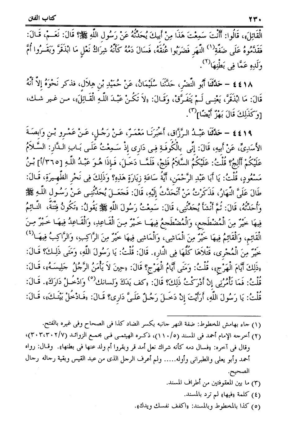 4419 - حَدَّثَنَا عَبْدُ الرَّزَّاقِ، أَخْبَرَنَا مَعْمَرٌ، عَنْ رَجُلٍ، عَنْ عَمْرِو بْنِ وَابِصَةَ الأَسَدِىِّ، عَنْ أَبِيهِ، قَالَ: إِنِّى بِالْكُوفَةِ فِى دَارِى إِذْ سَمِعْتُ عَلَى بَابِ الدَّارِ: السَّلاَمُ عَلَيْكُمْ أَأَلِجُ؟ قُلْتُ: عَلَيْكُمُ السَّلاَمُ فَلِجْ، فَلَمَّا دَخَلَ، فَإِذَا هُوَ عَبْدُ اللَّهِ بْنُ مَسْعُودٍ، قُلْتُ: يَا أَبَا عَبْدِ الرَّحْمَنِ، أَيَّةُ سَاعَةِ زِيَارَةٍ هَذِهِ؟ وَذَلِكَ فِى نَحْرِ الظَّهِيرَةِ، قَالَ: طَالَ عَلَىَّ النَّهَارُ، فَذَكَرْتُ مَنْ أَتَحَدَّثُ إِلَيْهِ، قَالَ: فَجَعَلَ يُحَدِّثُنِى عَنْ رَسُولِ اللَّهِ صلى الله عليه وسلم وَأُحَدِّثُهُ، قَالَ: ثُمَّ أَنْشَأَ يُحَدِّثُنِى، قَالَ: سَمِعْتُ رَسُولَ اللَّهِ صلى الله عليه وسلم يَقُولُ: تَكُونُ فِتْنَةٌ، النَّائِمُ فِيهَا خَيْرٌ مِنَ الْمُضْطَجِعِ، وَالْمُضْطَجِعُ فِيهَا خَيْرٌ مِنَ الْقَاعِدِ، وَالْقَاعِدُ فِيهَا خَيْرٌ مِنَ الْقَائِمِ، وَالْقَائِمُ فِيهَا خَيْرٌ مِنَ الْمَاشِى، وَالْمَاشِى فِيهَا خَيْرٌ مِنَ الرَّاكِبِ، وَالرَّاكِبُ فِيهَا خَيْرٌ مِنَ الْمُجْرِى، قَتْلاَهَا كُلُّهَا فِى النَّارِ. قَالَ: قُلْتُ: يَا رَسُولَ اللَّهِ، وَمَتَى ذَلِكَ؟ قَالَ: ذَلِكَ أَيَّامَ الْهَرْجِ، قُلْتُ: وَمَتَى أَيَّامُ الْهَرْجِ؟ قَالَ: حِينَ لاَ يَأْمَنُ الرَّجُلُ جَلِيسَهُ، قَالَ: قُلْتُ: فَمَا تَأْمُرُنِى إِنْ أَدْرَكْتُ ذَلِكَ؟ قَالَ: كف يَدَكَ وَلسانك وَادْخُلْ دَارَكَ. قَالَ: قُلْتُ: يَا رَسُولَ اللَّهِ، أَرَأَيْتَ إِنْ دَخَلَ رَجُلٌ عَلَىَّ دَارِى؟ قَالَ: فَادْخُلْ بَيْتَكَ، قَالَ: -[231]- قُلْتُ: أَفَرَأَيْتَ إِنْ دَخَلَ عَلَىَّ بَيْتِى؟ قَالَ: فَادْخُلْ مَسْجِدَكَ، وَاصْنَعْ هَكَذَا، وَقَبَضَ بِيَمِينِهِ عَلَى الْكُوعِ، وَقُلْ رَبِّىَ اللَّهُ حَتَّى تَمُوتَ عَلَى ذَلِكَ.