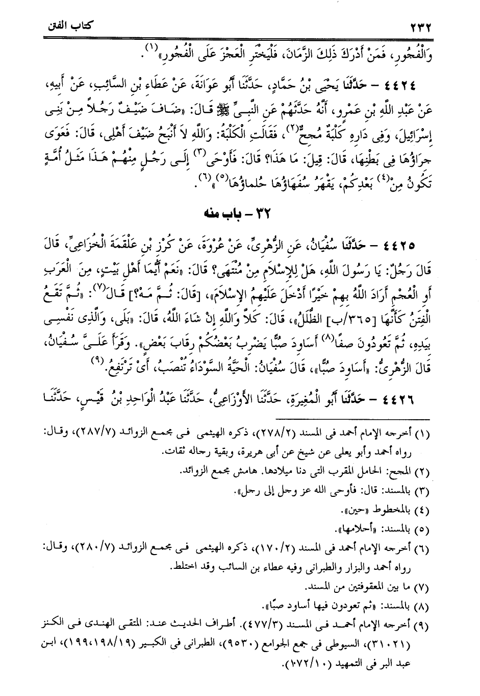 4425 - حَدَّثَنَا سُفْيَانُ، عَنِ الزُّهْرِىِّ، عَنْ عُرْوَةَ، عَنْ كُرْزِ بْنِ عَلْقَمَةَ الْخُزَاعِىِّ، قَالَ قَالَ رَجُلٌ: يَا رَسُولَ اللَّهِ، هَلْ لِلإِسْلاَمِ مِنْ مُنْتَهَى؟ قَالَ: نَعَمْ أَيُّمَا أَهْلِ بَيْتٍ، مِنَ الْعَرَبِ أَوِ الْعُجْمِ أَرَادَ اللَّهُ بِهِمْ خَيْرًا أَدْخَلَ عَلَيْهِمُ الإِسْلاَمَ، [قَالَ: ثُمَّ مَهْ؟] قَالَ: ثُمَّ تَقَعُ الْفِتَنُ كَأَنَّهَا الظُّلَلُ، قَالَ: كَلاَّ وَاللَّهِ إِنْ شَاءَ اللَّهُ، قَالَ: بَلَى، وَالَّذِى نَفْسِى بِيَدِهِ، ثُمَّ تَعُودُونَ صفًا أَسَاوِدَ صُبًّا يَضْرِبُ بَعْضُكُمْ رِقَابَ بَعْضٍ. وَقَرَأَ عَلَىَّ سُفْيَانُ، قَالَ الزُّهْرِىُّ: أَسَاوِدَ صُبًّا، قَالَ سُفْيَانُ: الْحَيَّةُ السَّوْدَاءُ تُنْصَبُ، أَىْ تَرْتَفِعُ.