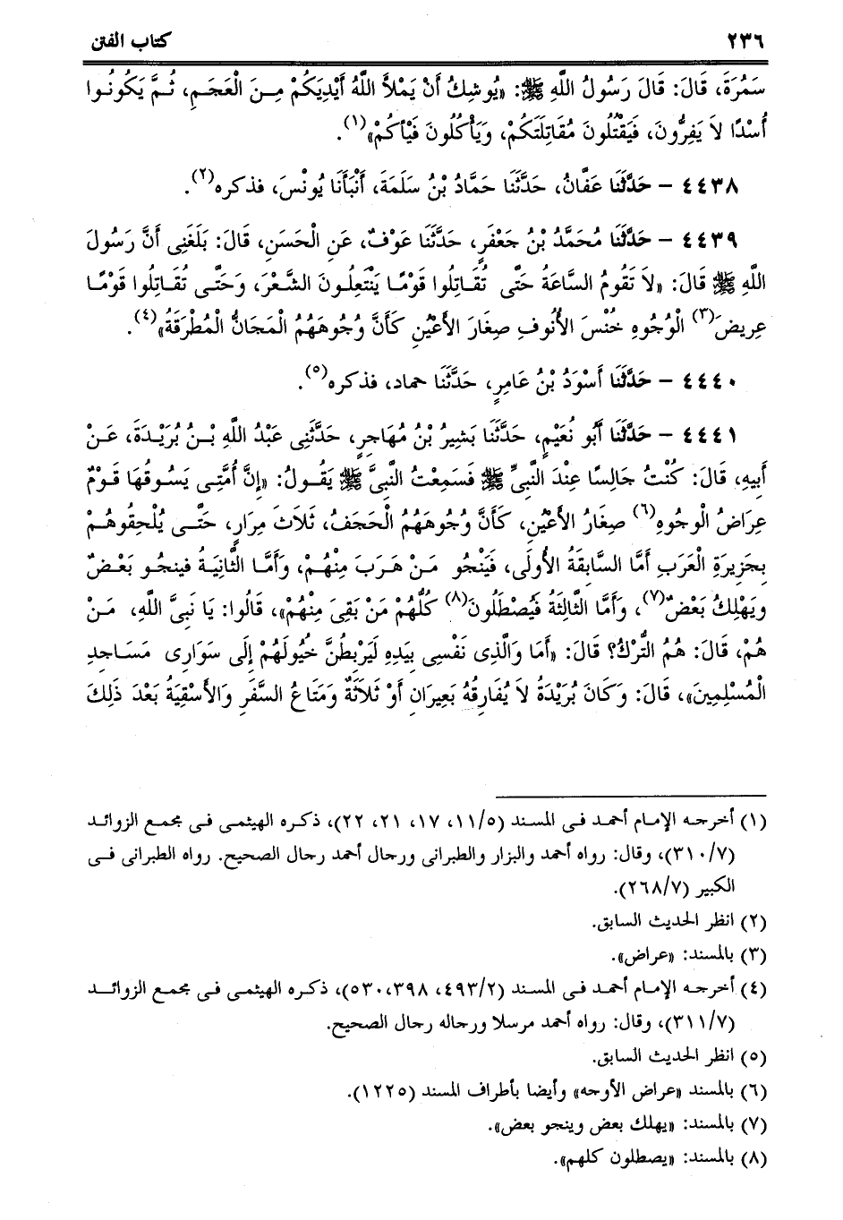 4441 - حَدَّثَنَا أَبُو نُعَيْمٍ، حَدَّثَنَا بَشِيرُ بْنُ مُهَاجِرٍ، حَدَّثَنِى عَبْدُ اللَّهِ بْنُ بُرَيْدَةَ، عَنْ أَبِيهِ، قَالَ: كُنْتُ جَالِسًا عِنْدَ النَّبِىِّ صلى الله عليه وسلم فَسَمِعْتُ النَّبِىَّ صلى الله عليه وسلم يَقُولُ: إِنَّ أُمَّتِى يَسُوقُهَا قَوْمٌ عِرَاضُ الْوجُوهِ صِغَارُ الأَعْيُنِ، كَأَنَّ وُجُوهَهُمُ الْحَجَفُ، ثَلاَثَ مِرَارٍ، حَتَّى يُلْحِقُوهُمْ بِجَزِيرَةِ الْعَرَبِ أَمَّا السَّابِقَةُ الأُولَى، فَيَنْجُو مَنْ هَرَبَ مِنْهُمْ، وَأَمَّا الثَّانِيَةُ فينجُو بَعْضٌ ويَهْلِكُ بَعْضٌ، وَأَمَّا الثَّالِثَةُ فَيُصْطَلُونَ كُلُّهُمْ مَنْ بَقِىَ مِنْهُمْ، قَالُوا: يَا نَبِىَّ اللَّهِ، مَنْ هُمْ، قَالَ: هُمُ التُّرْكُ؟ قَالَ: أَمَا وَالَّذِى نَفْسِى بِيَدِهِ لَيَرْبِطُنَّ خُيُولَهُمْ إِلَى سَوَارِى مَسَاجِدِ الْمُسْلِمِينَ، قَالَ: وَكَانَ بُرَيْدَةُ لاَ يُفَارِقُهُ بَعِيرَانِ أَوْ ثَلاَثَةٌ وَمَتَاعُ السَّفَرِ وَالأَسْقِيَةُ بَعْدَ -[237]- ذَلِكَ لِلْهَرَبِ مِمَّا سَمِعَ مِنَ النَّبِىِّ صلى الله عليه وسلم مِنَ الْبَلاَءِ مِنْ [أُمَرَاءِ] التُّرْكِ.