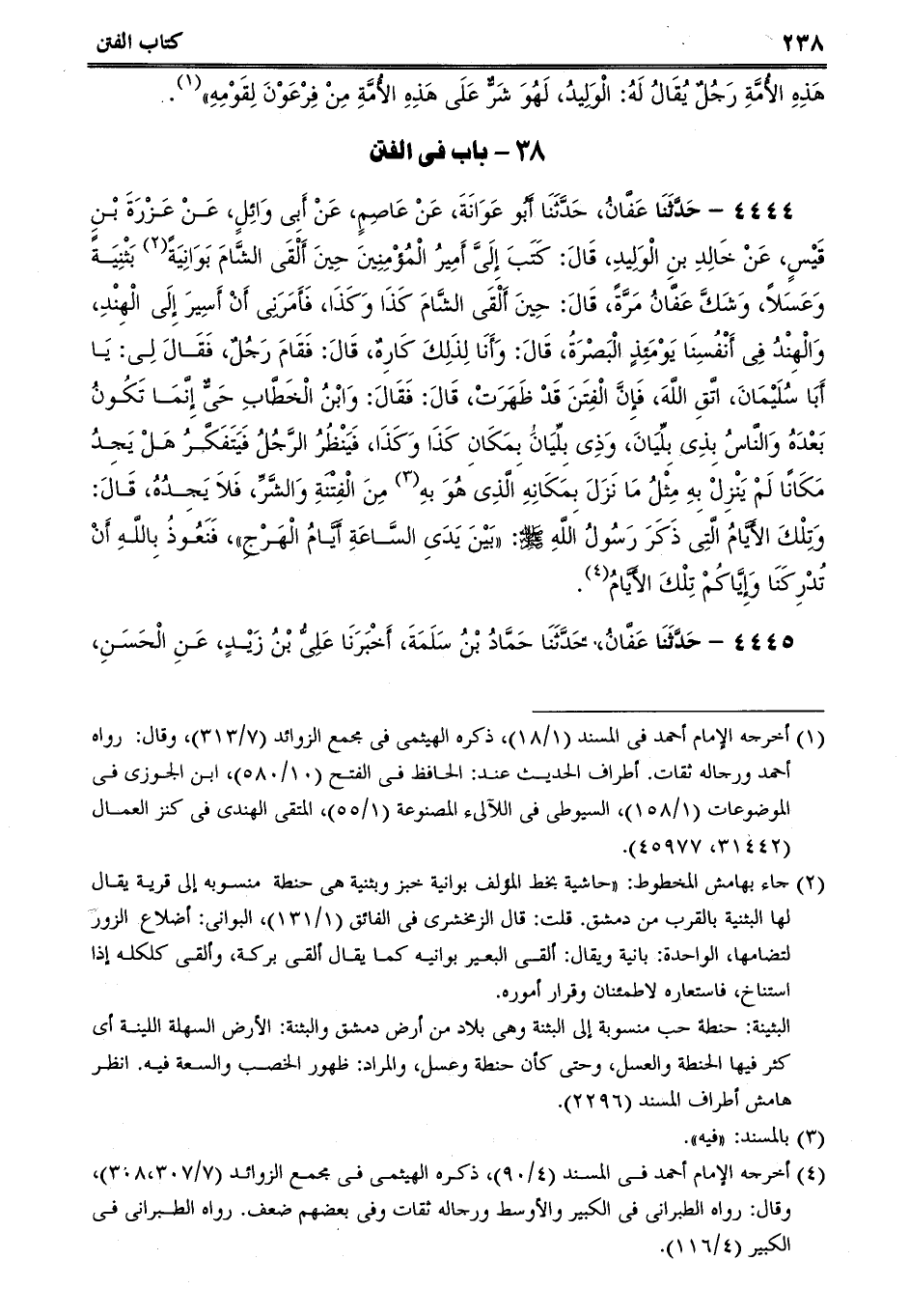4444 - حَدَّثَنَا عَفَّانُ، حَدَّثَنَا أَبُو عَوَانَةَ، عَنْ عَاصِمٍ، عَنْ أَبِى وَائِلٍ، عَنْ عَزْرَةَ بْنِ قَيْسٍ، عَنْ خَالِدِ بنِ الْوَلِيدِ، قَالَ: كَتَبَ إِلَىَّ أَمِيرُ الْمُؤْمِنِينَ حِينَ أَلْقَى الشَّامَ بَوَانِيَةً بَثْنِيَةً وَعَسَلاً، وَشَكَّ عَفَّانُ مَرَّةً، قَالَ: حِينَ أَلْقَى الشَّامَ كَذَا وَكَذَا، فَأَمَرَنِى أَنْ أَسِيرَ إِلَى الْهِنْدِ، وَالْهِنْدُ فِى أَنْفُسِنَا يَوْمَئِذٍ الْبَصْرَةُ، قَالَ: وَأَنَا لِذَلِكَ كَارِهٌ، قَالَ: فَقَامَ رَجُلٌ، فَقَالَ لِى: يَا أَبَا سُلَيْمَانَ، اتَّقِ اللَّهَ، فَإِنَّ الْفِتَنَ قَدْ ظَهَرَتْ، قَالَ: فَقَالَ: وَابْنُ الْخَطَّابِ حَىٌّ إِنَّمَا تَكُونُ بَعْدَهُ وَالنَّاسُ بِذِى بِلِّيَانَ، وَذِى بِلِّيَانَ بِمَكَانِ كَذَا وَكَذَا، فَيَنْظُرُ الرَّجُلُ فَيَتَفَكَّرُ هَلْ يَجِدُ مَكَانًا لَمْ يَنْزِلْ بِهِ مِثْلُ مَا نَزَلَ بِمَكَانِهِ الَّذِى هُوَ بهِ مِنَ الْفِتْنَةِ وَالشَّرِّ، فَلاَ يَجِدُهُ، قَالَ: وَتِلْكَ الأَيَّامُ الَّتِى ذَكَرَ رَسُولُ اللَّهِ صلى الله عليه وسلم: بَيْنَ يَدَىِ السَّاعَةِ أَيَّامُ الْهَرْجِ، فَنَعُوذُ بِاللَّهِ أَنْ تُدْرِكَنَا وَإِيَّاكُمْ تِلْكَ الأَيَّامُ.