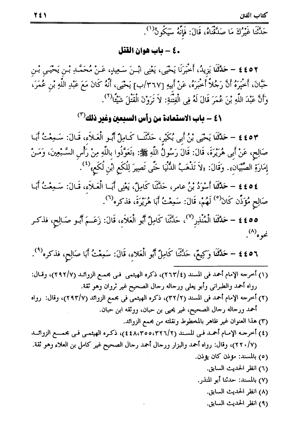 4454 - حَدَّثَنَا أَسْوَدُ بْنُ عامر، حَدَّثَنَا كَامِلٌ، يَعْنِى أَبَا الْعَلاَءِ، قَالَ: سَمِعْتُ أَبَا صَالِحٍ مُؤَذِّن كَانَ لَهُمْ، قَالَ: سَمِعْتُ أَبَا هُرَيْرَةَ، فذكره.