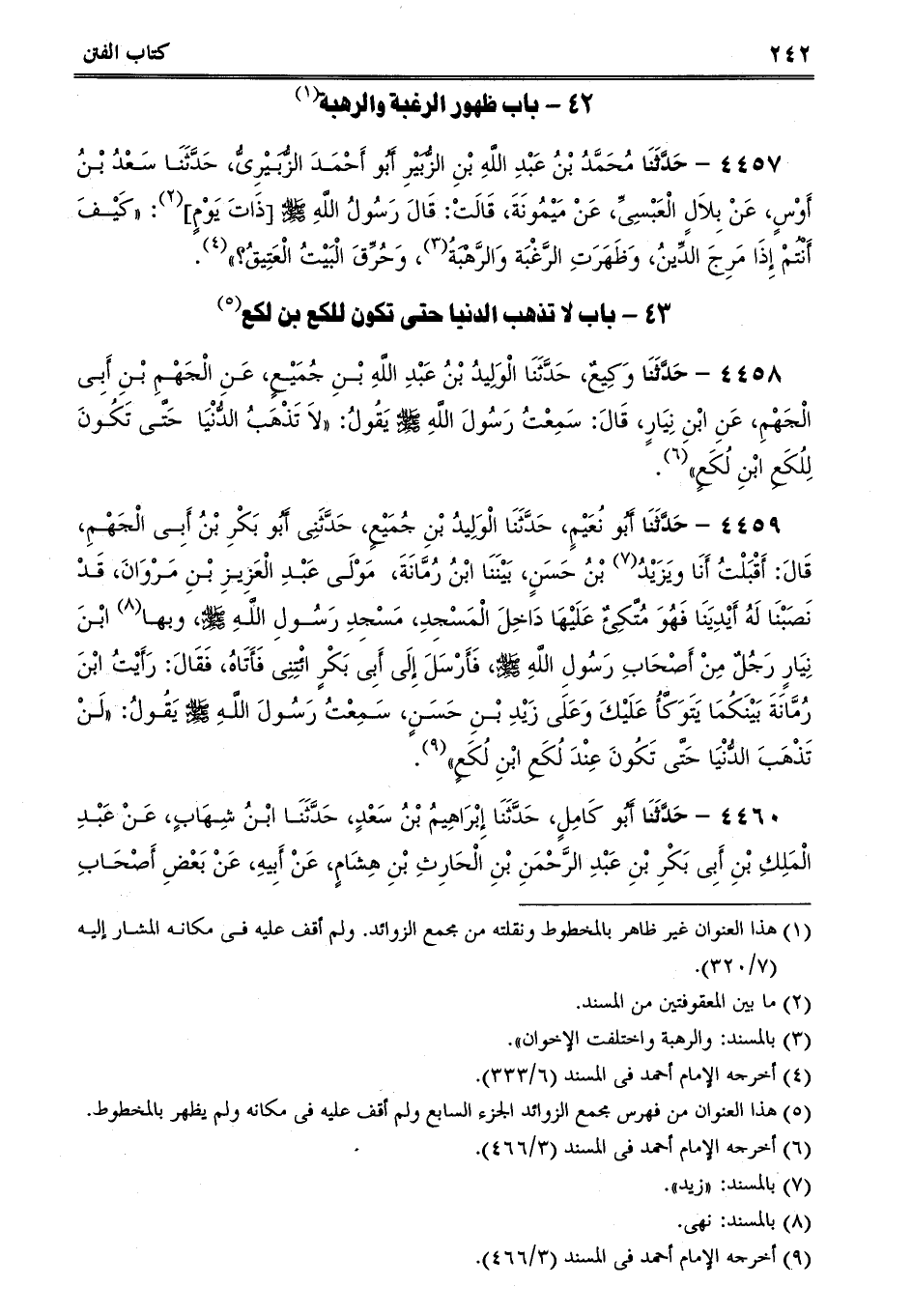 4457 - حَدَّثَنَا مُحَمَّدُ بْنُ عَبْدِ اللَّهِ بْنِ الزُّبَيْرِ أَبُو أَحْمَدَ الزُّبَيْرِىُّ، حَدَّثَنَا سَعْدُ بْنُ أَوْسٍ، عَنْ بِلاَلٍ الْعَبْسِىِّ، عَنْ مَيْمُونَةَ، قَالَتْ: قَالَ رَسُولُ اللَّهِ صلى الله عليه وسلم [ذَاتَ يَوْمٍ] : كَيْفَ أَنْتُمْ إِذَا مَرِجَ الدِّينُ، وَظَهَرَتِ الرَّغْبَة وَالرَّهْبَةُ، وَحُرِّقَ الْبَيْتُ الْعَتِيقُ؟.