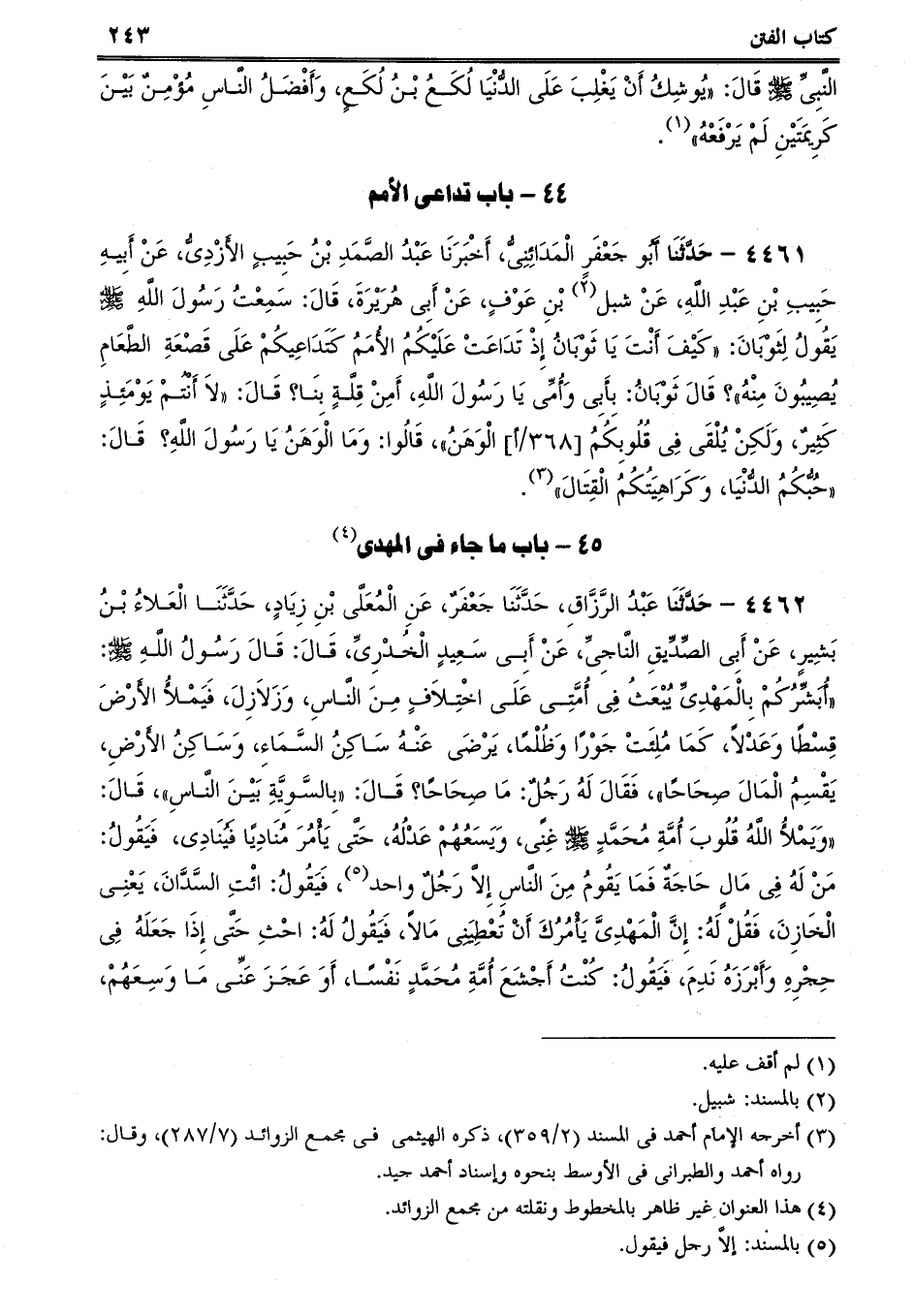 4462 - حَدَّثَنَا عَبْدُ الرَّزَّاقِ، حَدَّثَنَا جَعْفَرٌ، عَنِ الْمُعَلَّى بْنِ زِيَادٍ، حَدَّثَنَا الْعَلاءُ بْنُ بَشِيرٍ، عَنْ أَبِى الصِّدِّيقِ النَّاجِىِّ، عَنْ أَبِى سَعِيدٍ الْخُدْرِىِّ، قَالَ: قَالَ رَسُولُ اللَّهِ صلى الله عليه وسلم: أُبَشِّرُكُمْ بِالْمَهْدِىِّ يُبْعَثُ فِى أُمَّتِى عَلَى اخْتِلاَفٍ مِنَ النَّاسِ، وَزَلاَزِلَ، فَيَمْلأُ الأَرْضَ قِسْطًا وَعَدْلاً، كَمَا مُلِئَتْ جَوْرًا وَظُلْمًا، يَرْضَى عَنْهُ سَاكِنُ السَّمَاءِ، وَسَاكِنُ الأَرْضِ، يَقْسِمُ الْمَالَ صِحَاحًا، فَقَالَ لَهُ رَجُلٌ: مَا صِحَاحًا؟ قَالَ: بِالسَّوِيَّةِ بَيْنَ النَّاسِ، قَالَ: وَيَمْلأُ اللَّهُ قُلُوبَ أُمَّةِ مُحَمَّدٍ صلى الله عليه وسلم غِنًى، وَيَسَعُهُمْ عَدْلُهُ، حَتَّى يَأْمُرَ مُنَادِيًا فَيُنَادِى، فَيَقُولُ: مَنْ لَهُ فِى مَالٍ حَاجَةٌ فَمَا يَقُومُ مِنَ النَّاسِ إِلاَّ رَجُلٌ واحد، فَيَقُولُ: ائْتِ السَّدَّانَ، يَعْنِى الْخَازِنَ، فَقُلْ لَهُ: إِنَّ الْمَهْدِىَّ يَأْمُرُكَ أَنْ تُعْطِيَنِى مَالاً، فَيَقُولُ لَهُ: احْثِ حَتَّى إِذَا جَعَلَهُ فِى حِجْرِهِ وَأَبْرَزَهُ نَدِمَ، فَيَقُولُ: كُنْتُ أَجْشَعَ أُمَّةِ مُحَمَّدٍ نَفْسًا، أَوَ عَجَزَ عَنِّى مَا وَسِعَهُمْ، -[244]- قَالَ: فَيَرُدُّهُ فَلاَ يَقْبَلُ مِنْهُ، فَيُقَالُ لَهُ: إِنَّا لاَ نَأْخُذُ شَيْئًا أَعْطَيْنَاهُ، فَيَكُونُ كَذَلِكَ سَبْعَ سِنِينَ، أَوْ ثَمَانِ سِنِينَ، أَوْ تِسْعَ سِنِينَ، ثُمَّ لاَ خَيْرَ فِى الْعَيْشِ بَعْدَهُ، أَوْ قَالَ: ثُمَّ لاَ خَيْرَ فِى الْحَيَاةِ بَعْدَهُ.